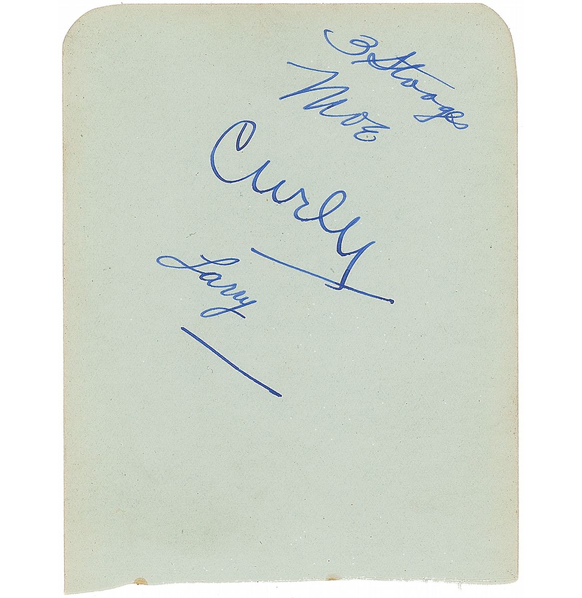 Choice fountain pen signatures, “3 Stooges, Moe,” “Curly,” and “Larry,” on a light green 4.5 x 3.5 album page. In fine condition. A very nice uninscribed example of the trio’s most popular line-up.