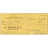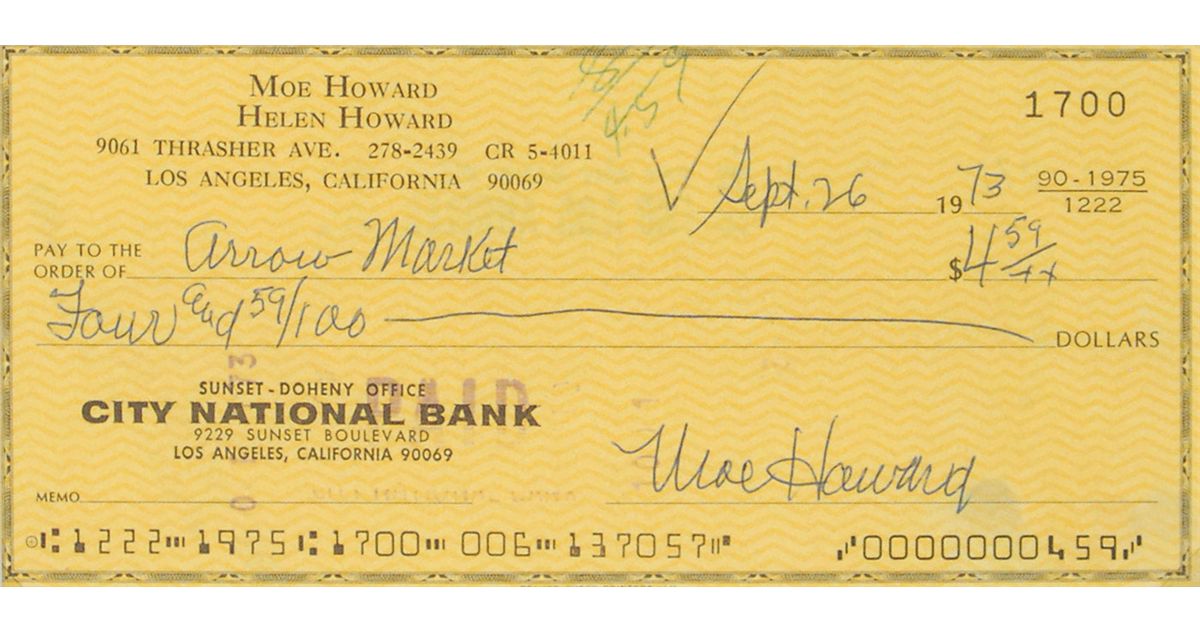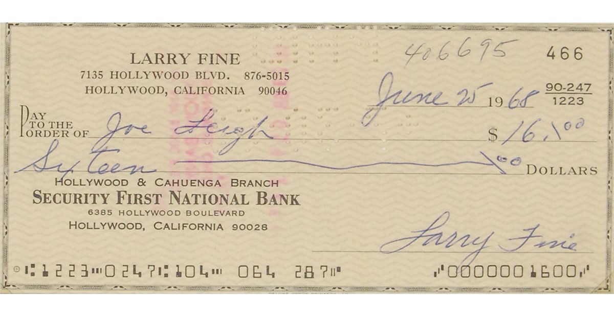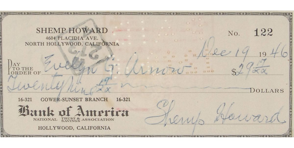 Three personal checks, all approximately 5.75 x 2.5, each filled out and signed by a member of the Three Stooges. One from 1946 signed by Shemp Howard; one from 1968 signed by Larry Fine; and one from 1973 signed by Moe Howard. All three are matted together with a portrait of the three to an overall size of 17.75 x 21. In fine condition, with expected cancellation holes and stamps, with a central vertical fold to Larry’s check, several folds to Shemp’s, one through a single letter of signature, and a small crack to glass.