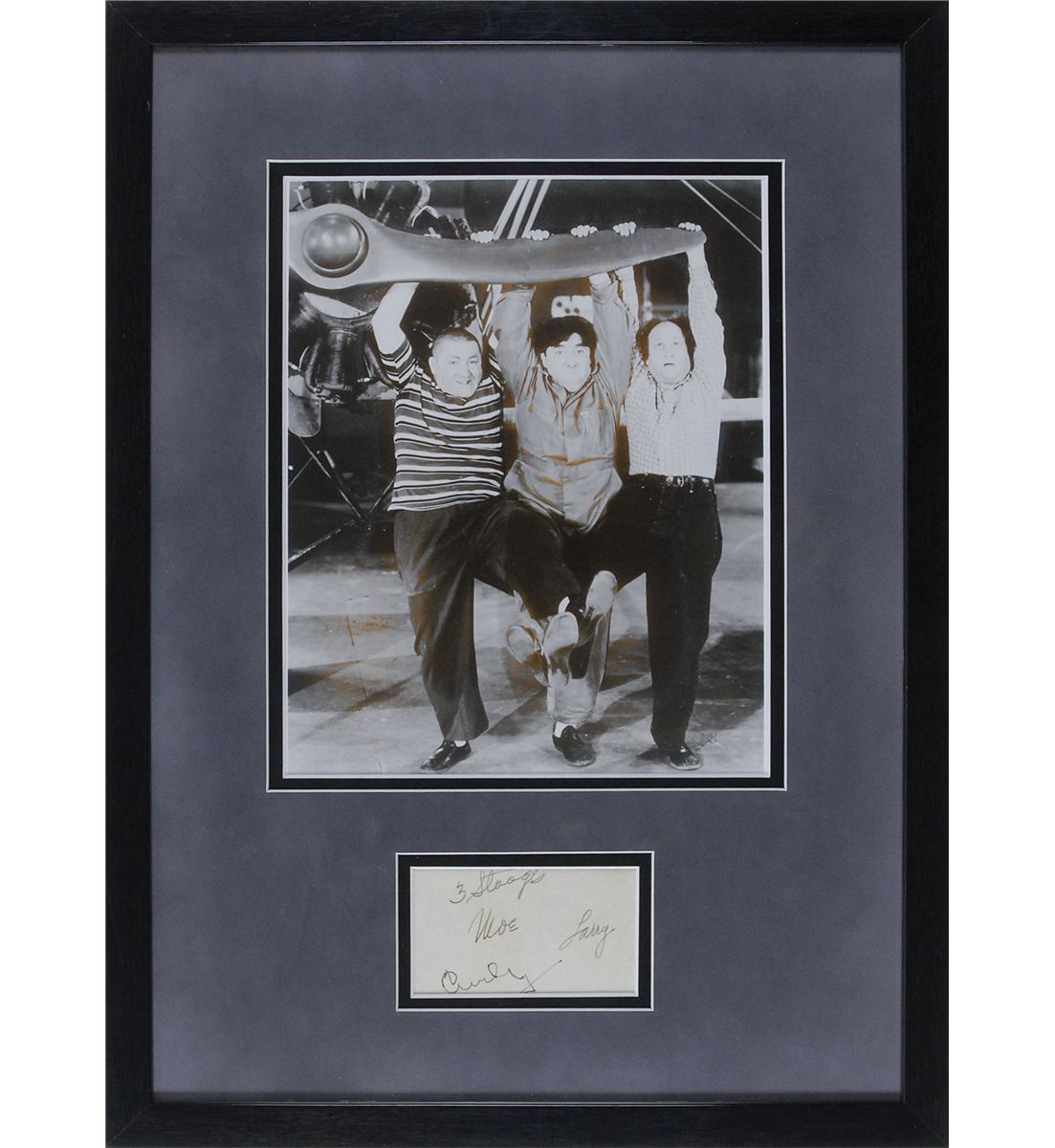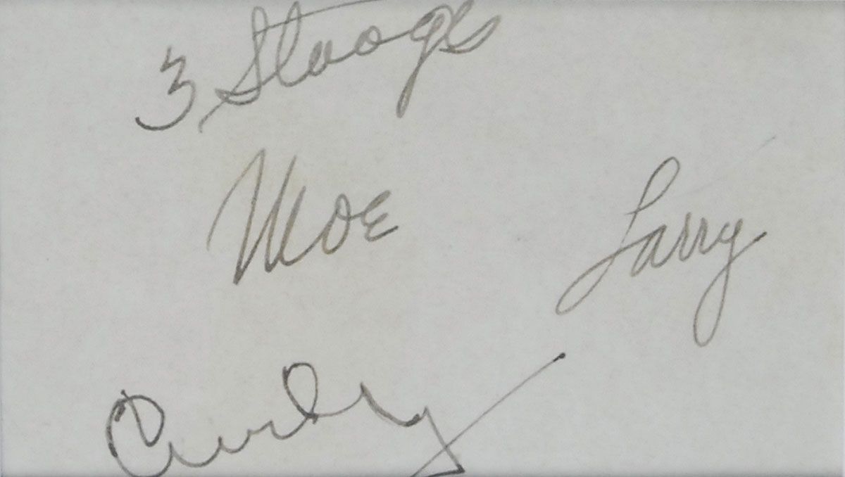 Vintage fountain pen signatures, “3 Stooges, Moe,” “Larry,” and “Curly” on an off-white album page. Double-suede-matted and framed with a photo of the Stooges hanging from a plane propeller to an overall size of 13.25 x 18.25. In fine condition.