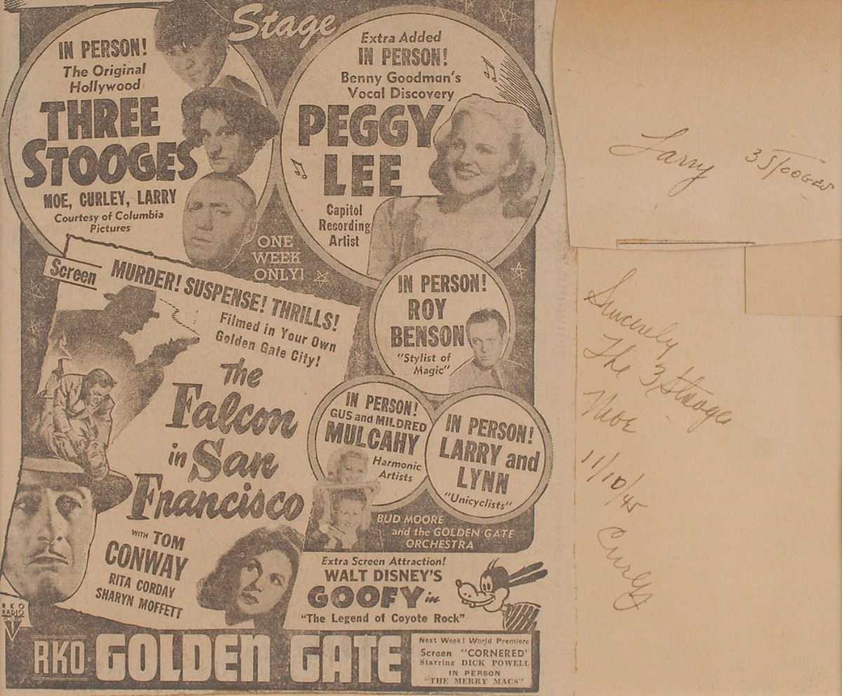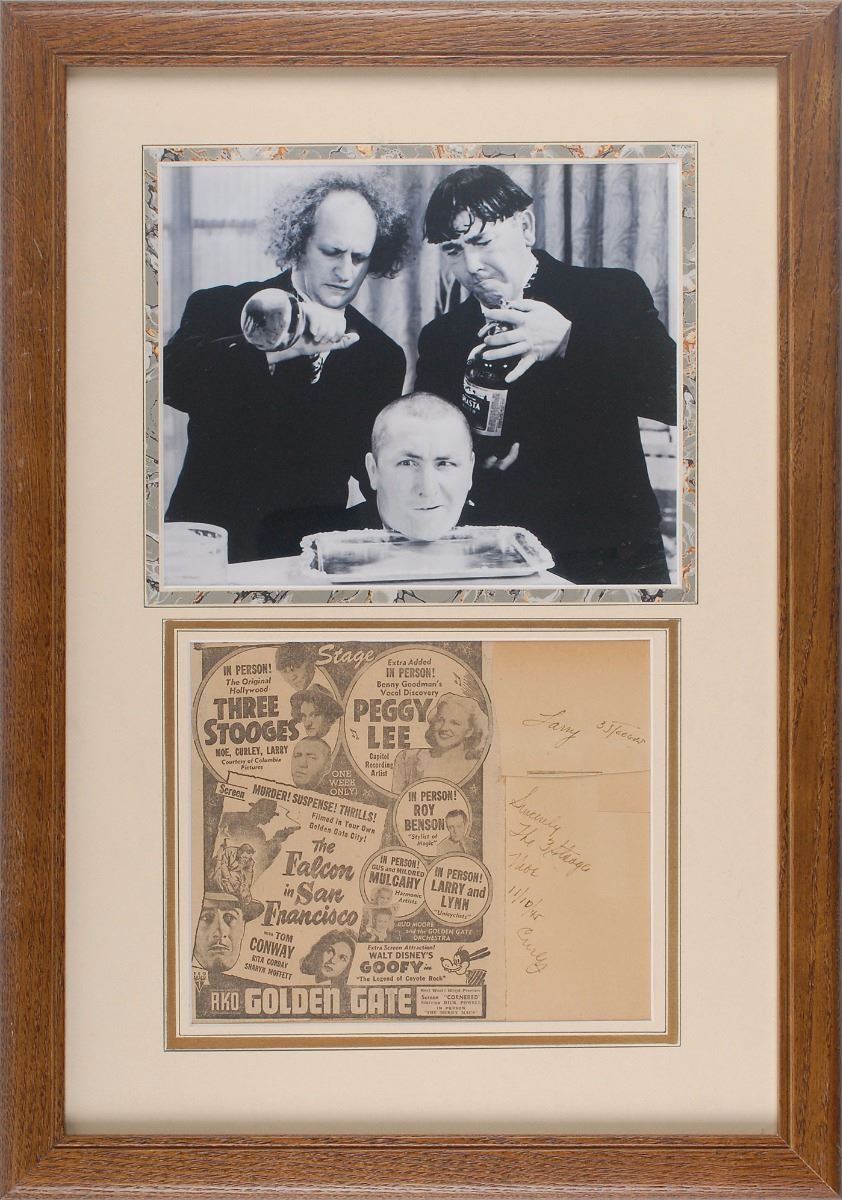 Fountain pen signatures, “Sincerely, The 3 Stooges, Moe, 11/10/45,” “Curly,” and “Larry, 3 Stooges,” on two slips clipped from scrapbook pages and affixed to a 8.5 x 7 sheet next to an advertisement. Matted and framed with a photo of the classic comedians to an overall size of 15.5 x 22. Uniform toning and irregularly trimmed edges, otherwise fine condition.