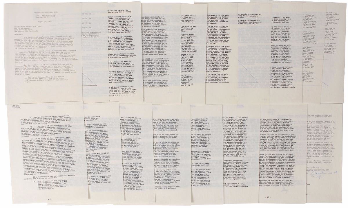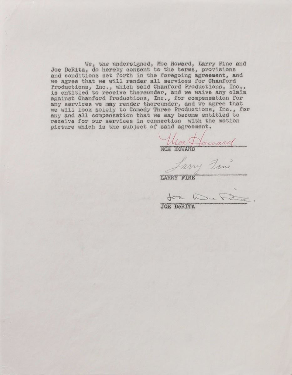 DS, nineteen pages, 8.5 x 11, August 10, 1960. Agreement between Chanford Productions and Comedy Three Productions, in which the latter agrees to lend “the services of Moe Howard, Joe DeRita and Larry Fine…in connection with the portrayal of the roles of ‘The Three Stooges’” for a motion picture “tentatively entitled ‘Snow White and the Three Stooges’” for the total sum of $75,000. Signed on the last page in red ballpoint by Howard, and in black ballpoint by Fine and DeRita. Housed in its original legal folder. In fine condition. Accompanied by three 20th Century Fox publicity photo stills from the 1961 film, a color laserprint photo of the film’s poster, and five copies of 20th Century Fox starting cards for the three comedians, as well as a copy of a closing notice for DeRita.