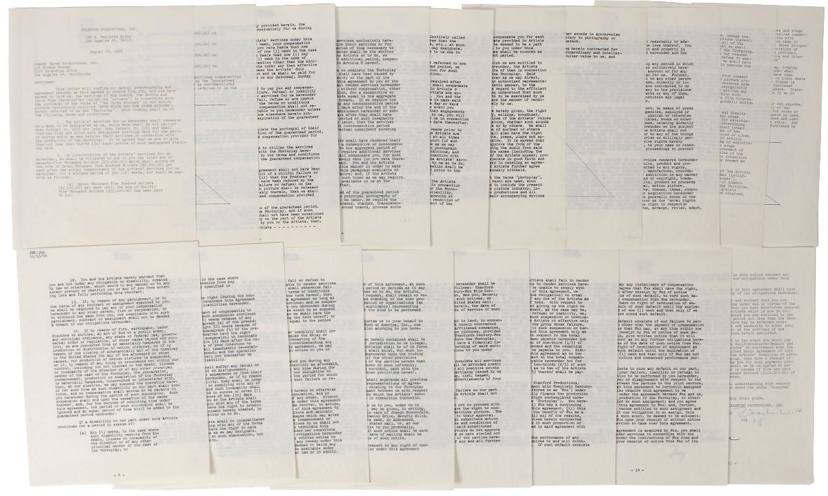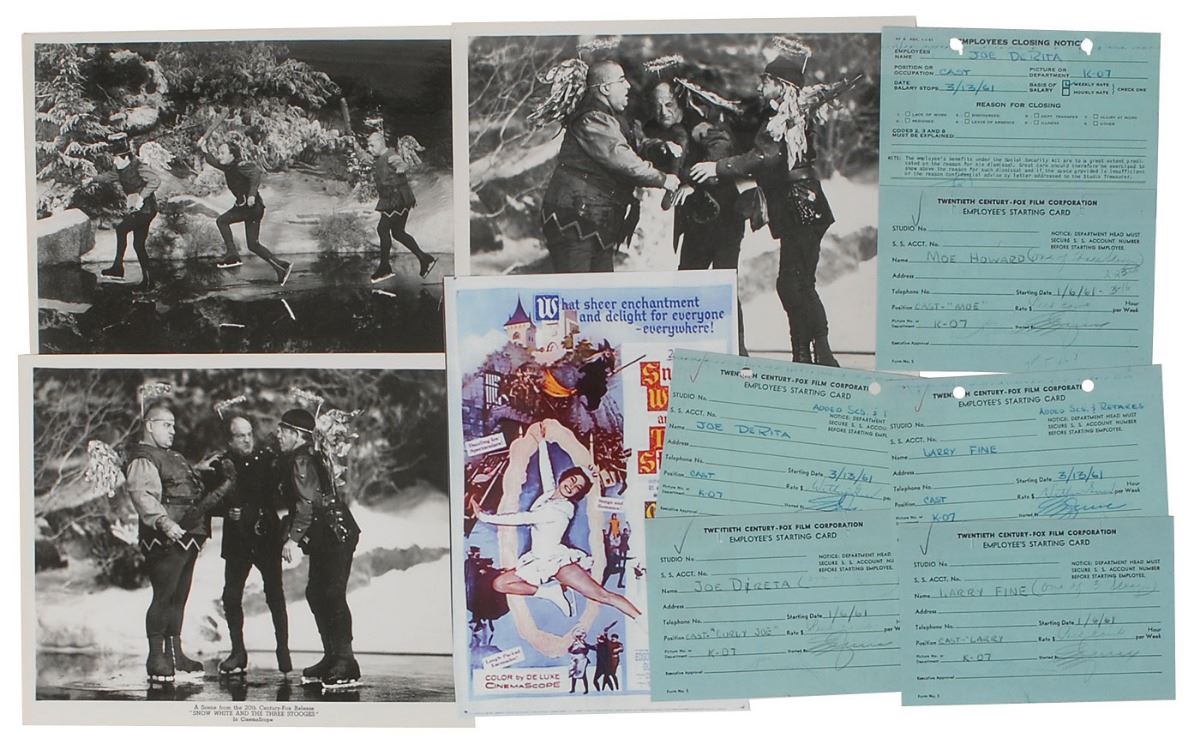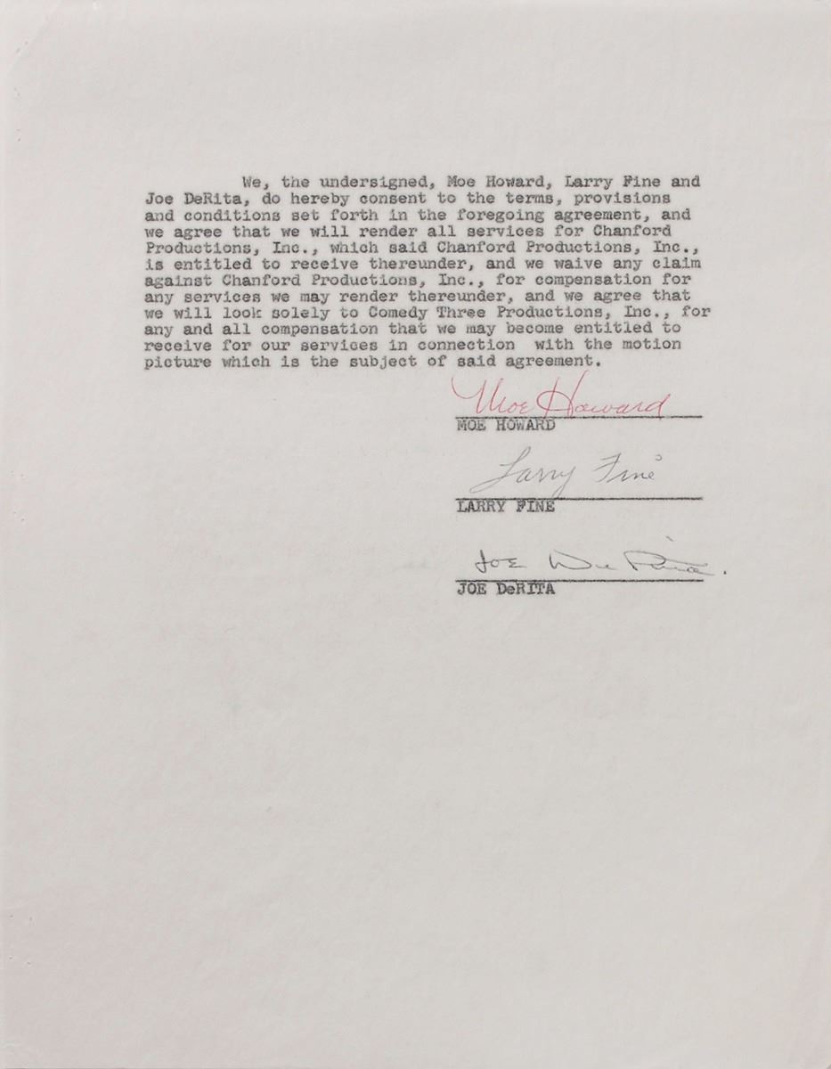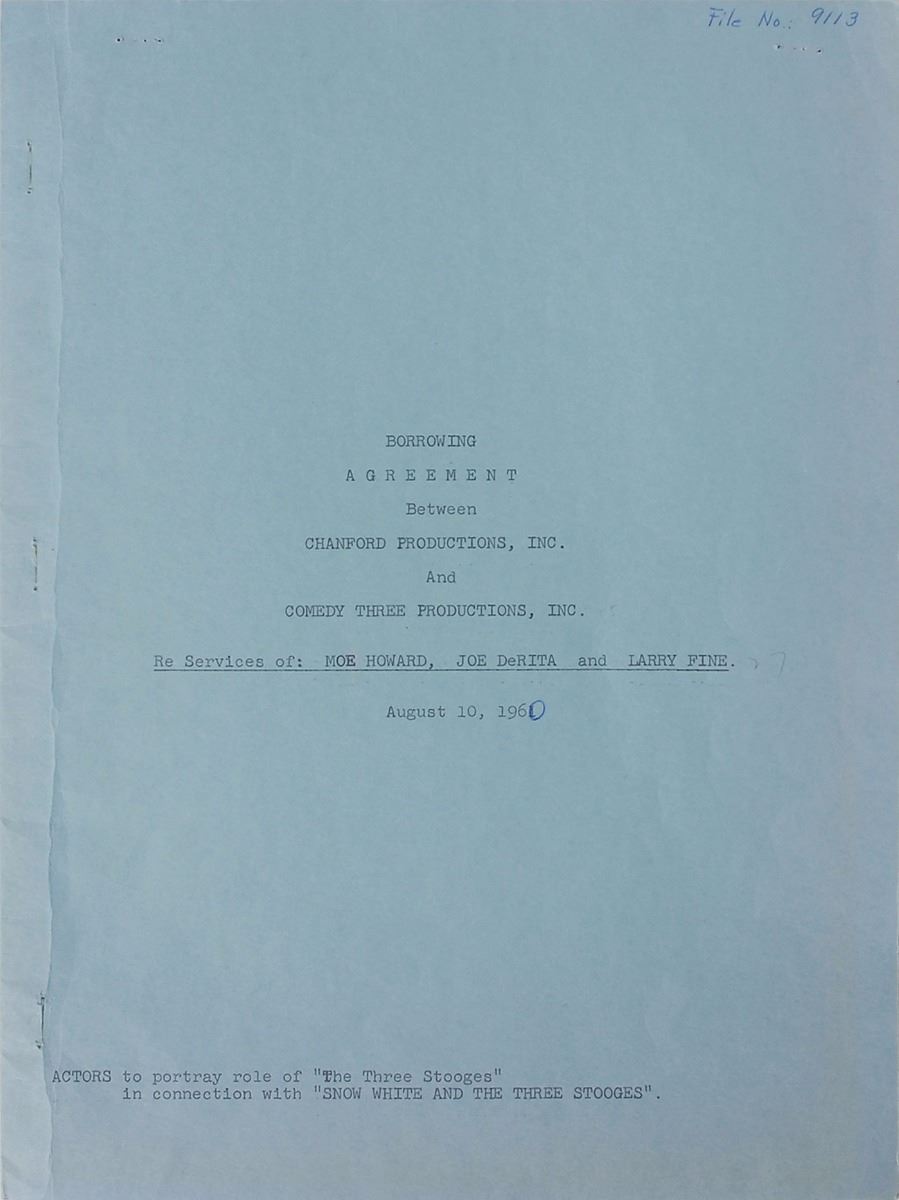 DS, nineteen pages, 8.5 x 11, August 10, 1960. Agreement between Chanford Productions and Comedy Three Productions, in which the latter agrees to lend “the services of Moe Howard, Joe DeRita and Larry Fine…in connection with the portrayal of the roles of ‘The Three Stooges’” for a motion picture “tentatively entitled ‘Snow White and the Three Stooges’” for the total sum of $75,000. Signed on the last page in red ballpoint by Howard, and in black ballpoint by Fine and DeRita. Housed in its original legal folder. In fine condition. Accompanied by three 20th Century Fox publicity photo stills from the 1961 film, a color laserprint photo of the film’s poster, and five copies of 20th Century Fox starting cards for the three comedians, as well as a copy of a closing notice for DeRita.