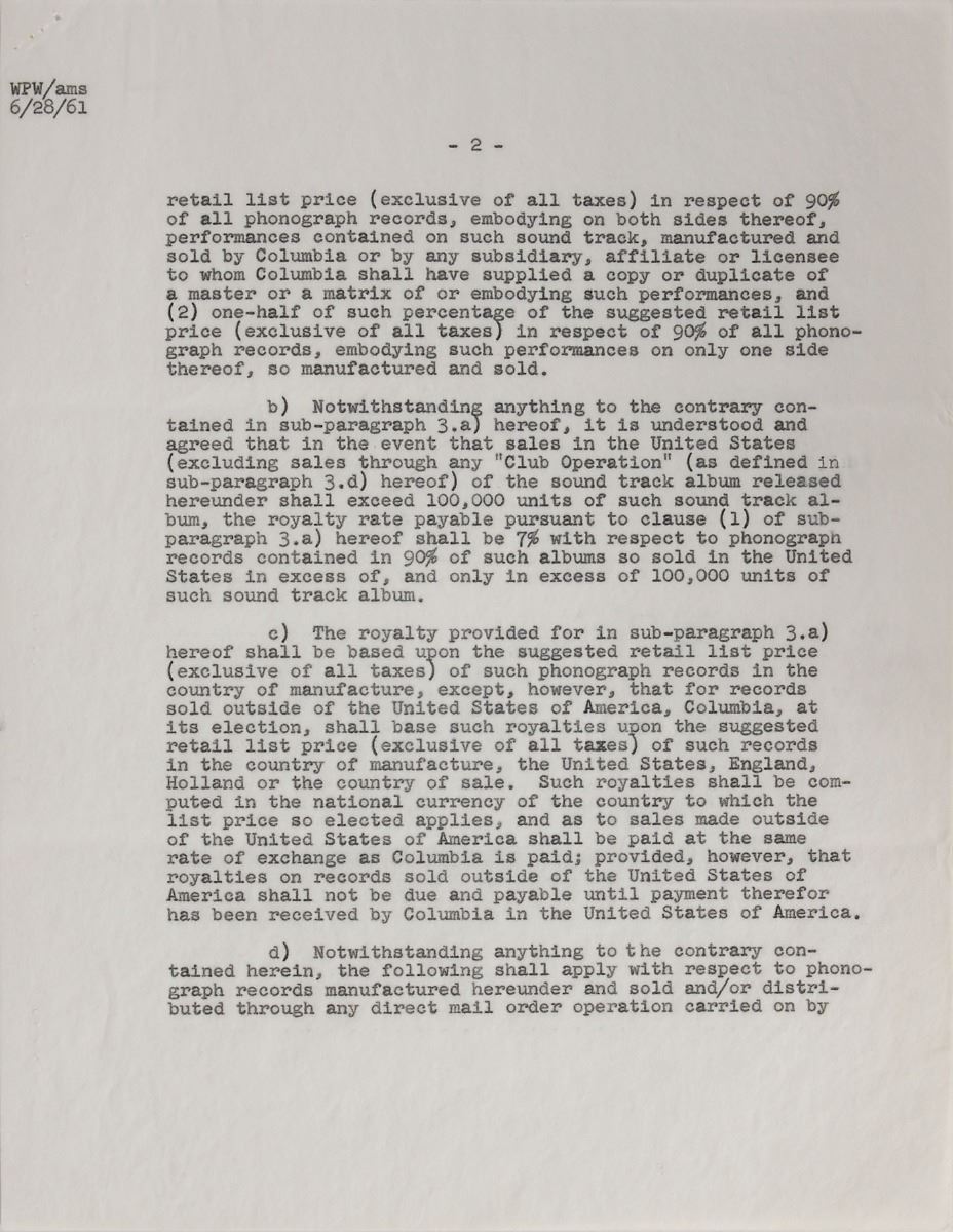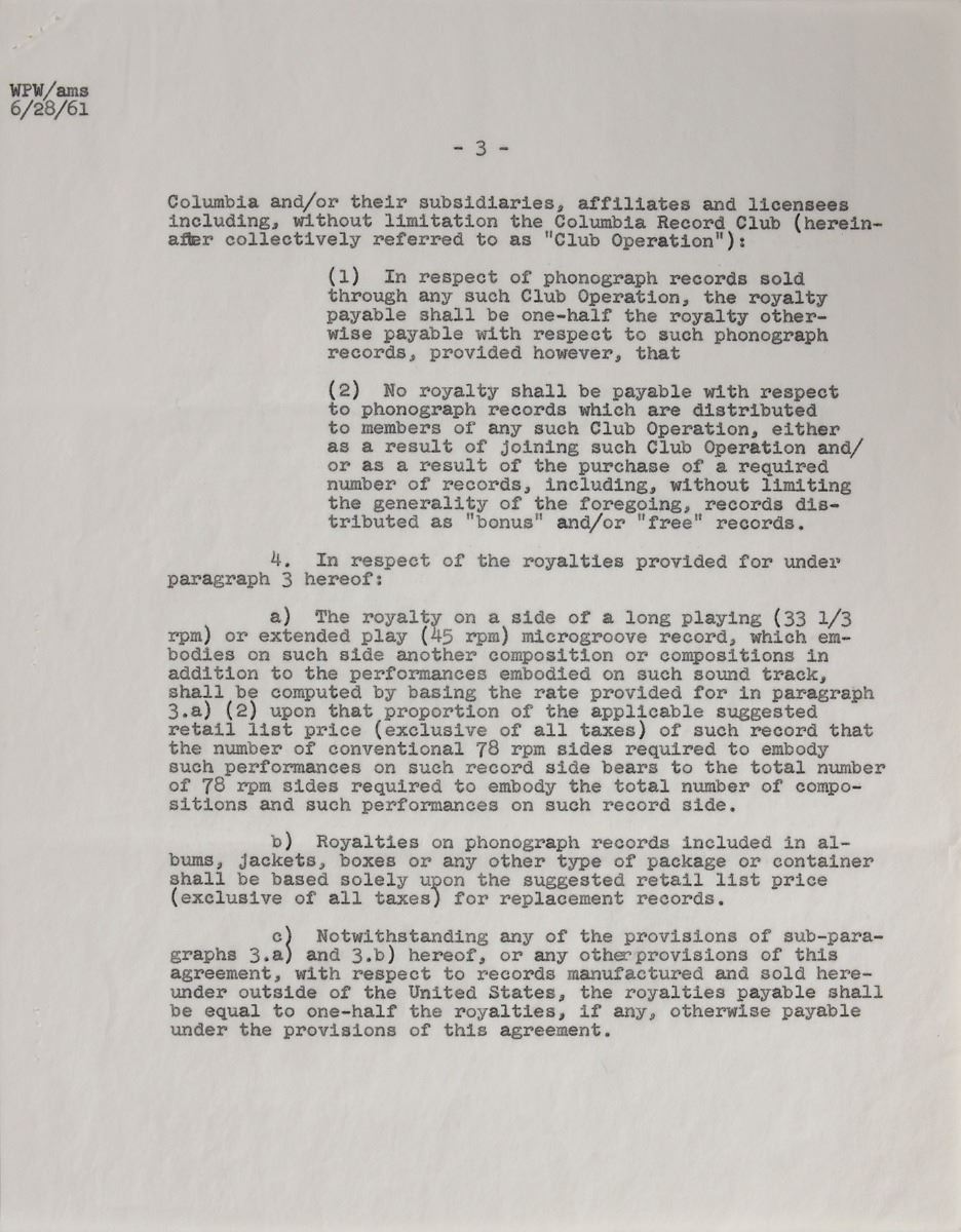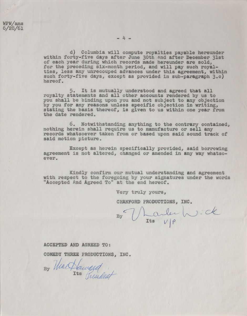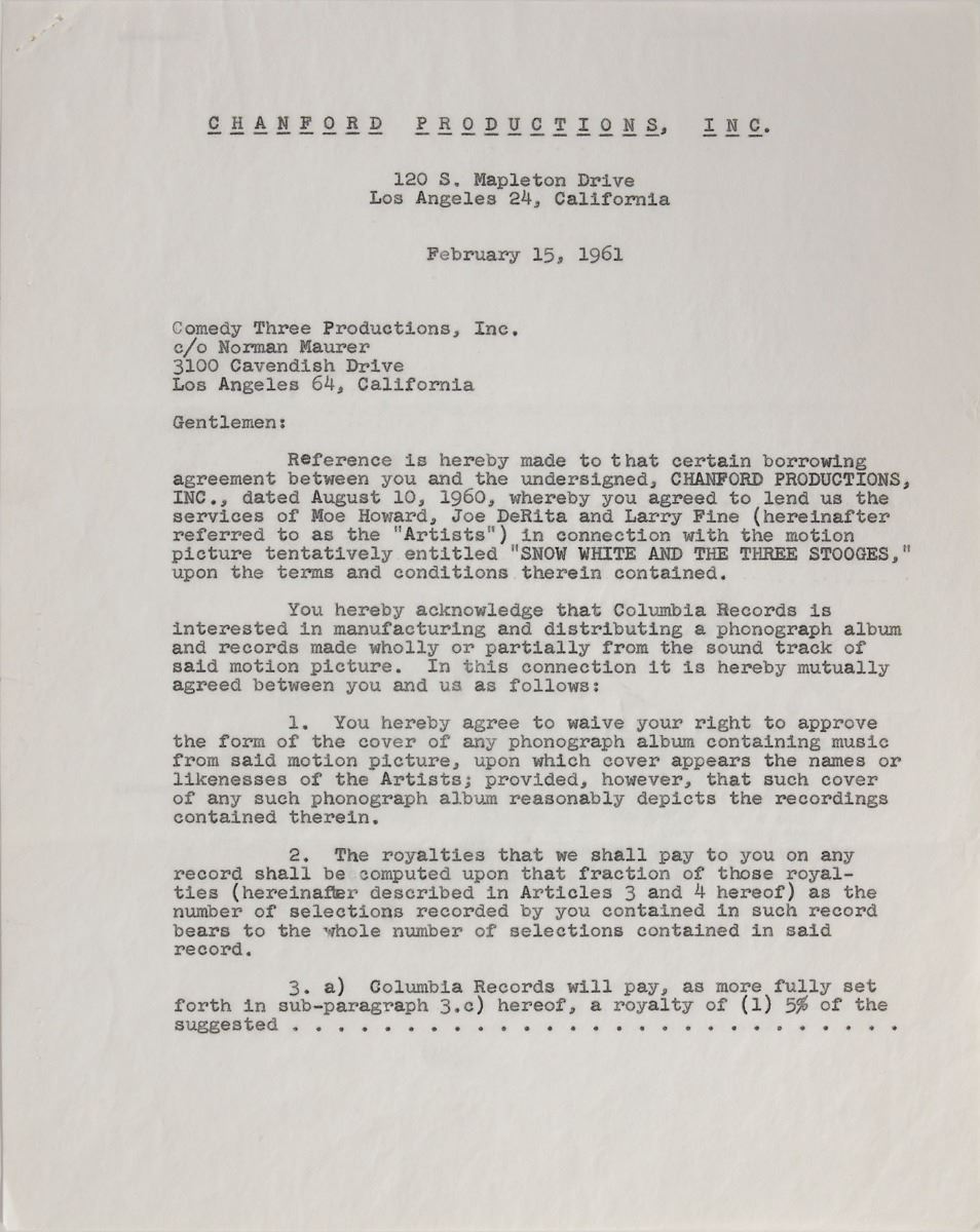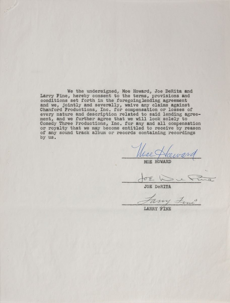 DS, five pages, 8.5 x 11, February 15, 1961. Agreement between the Three Stooges and Chanford Productions concerning royalties for a soundtrack album for “the motion picture tentatively entitled ‘Snow White and the Three Stooges.’” Signed on the fourth page in ballpoint by Howard, “Moe Howard, President,” and on the next page by all three, “Moe Howard,” “Joe DeRita,” and “Larry Fine.” Includes the original blue folder. In fine condition.