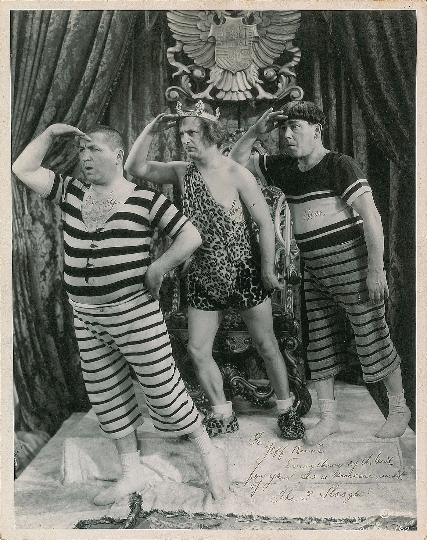 Stupendous vintage matte-finish 11 x 14 photo of the Three Stooges in appropriately outrageous attire, signed and inscribed in fountain pen by Moe, "To Jeff Keene, Everything of the best for you is a sincere wish of The 3 Stooges," and signed by each actor on their image: "Curly," "Larry," and "Moe.” In fine condition. Three Stooges photographs of this impressive size are ultra-rare and of the utmost desirability.