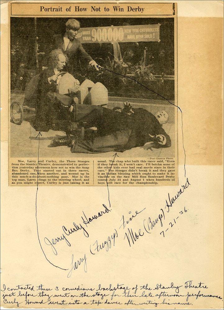 Vintage fountain pen signatures, “Jerry Curly Howard,” “Larry (Fuzzy) Fine,” and “Moe (Bangs) Howard, 7-21-36,” on an off-white 8 x 11 album page, with each Stooge drawing an arrow to their image on an affixed newspaper photo of the three of them clowning around with a Soap Box racer. Collector’s ink notations to bottom of page reads, “I contacted these 3 comedians backstage of Stanley Theatre just before they went on the stage for their late afternoon performance. Curly Howard went into a tap dance after writing his name.” In fine condition, with light toning to top portion of page and toning to news photo. Signatures featuring the Stooges' early, lesser-known nicknames are very uncommon.