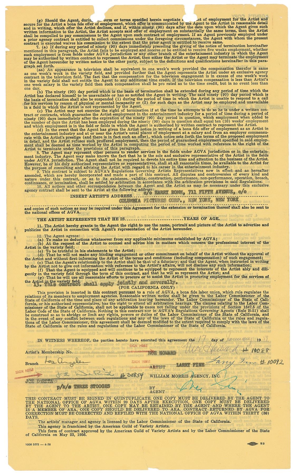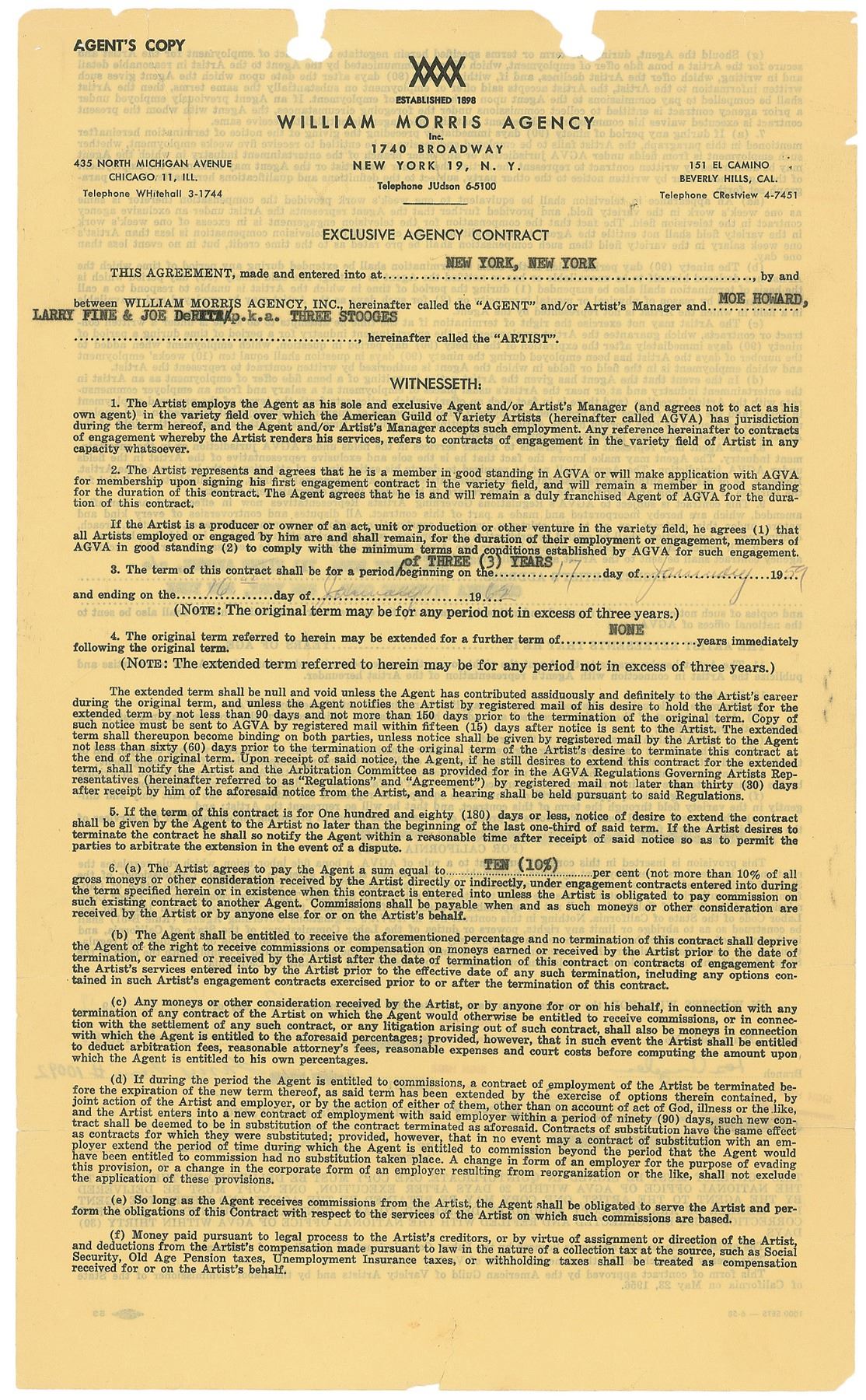 DS, signed “Moe Howard,” “Larry Fine,” and “Joe DeRita,” one page both sides, 8.5 x 14, January 17, 1959. Exclusive agency contract between the Three Stooges and the William Morris Agency for a period of three years at the standard ten percent commission. Signed on the reverse by all three members. In very good condition, with a couple partial separations along horizontal folds, scattered creases and small edge tears, and torn punch holes to top. In 1959 the Stooges found themselves back in public demand, following the syndication of the original Stooge shorts on television and their subsequent rediscovery by baby boomers. Throughout the 1960s, The Three Stooges were one of the most popular and highest-paid live acts in the country.