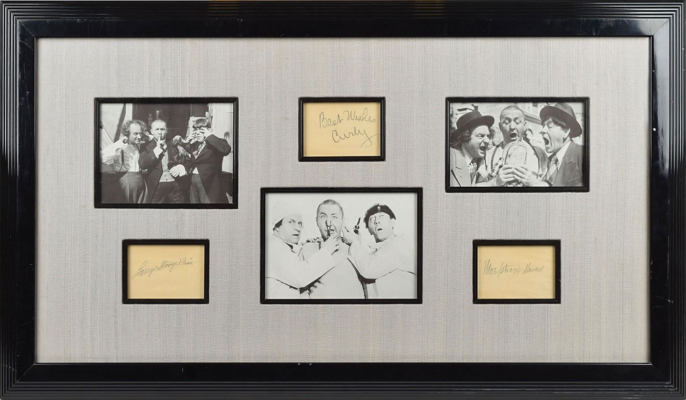 Spectacular set of pencil signatures of the Three Stooges, "Larry (Stooge) Fine," "Best Wishes, Curly," and "Moe (Stooge) Howard," on individual off-white 3.5 x 2.5 slips. Impressively cloth-matted and framed with a trio of portraits to an overall size of 33.5 x 19.5. In fine condition.