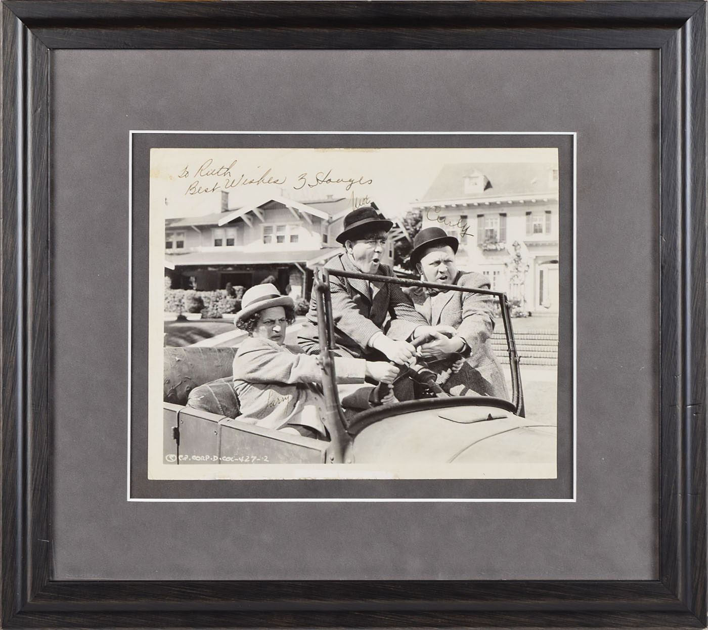 Vintage glossy 9.75 x 8 Columbia Pictures publicity still photo of Moe, Larry, and Curly all trying to steer a car at the same time during the 1934 short film Mutts to You, signed and inscribed in fountain pen, “To Ruth, Best wishes, Moe,” “Larry,” and “Curly.” Curly has also added “3 Stooges,” next to Moe’s inscription. Archivally double-suede-matted and framed to an overall size of 17 x 15. In very good condition, with trimmed right edge, scattered surface marks and creasing, heavier to the corners, small tear and paper loss to lower edge and light adhesive remnant to top edge.