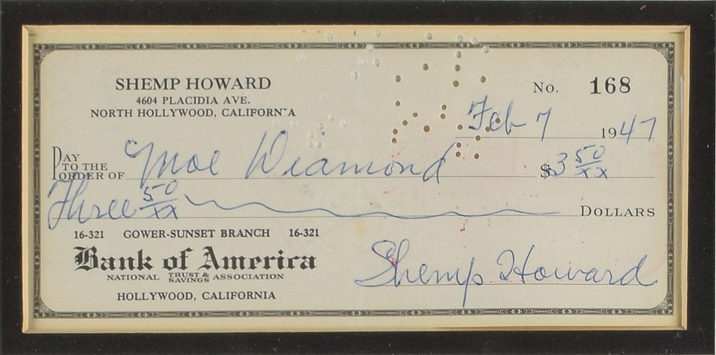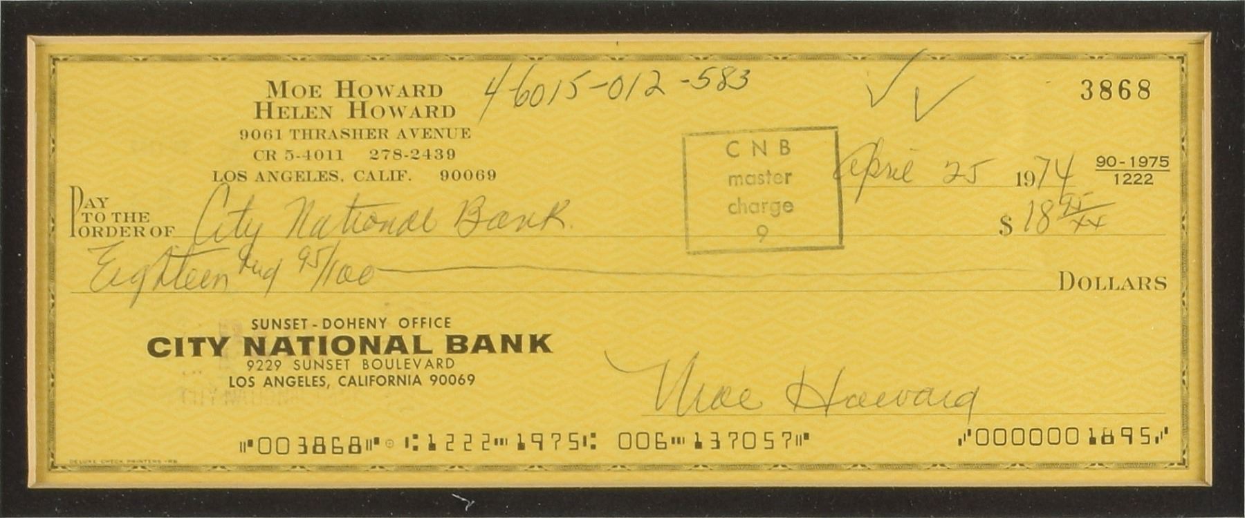 Fantastic grouping of three personal checks, each filled out and signed by the respective Stooge: Moe Howard (April 5, 1975); Shemp Howard (February 7, 1947); and Larry Fine (July 2, 1969). Nicely double-matted and framed with a still to an overall size of 14 x 24.5. In overall very good to fine condition, with a central vertical fold to both Shemp and Moe, and some light creasing to Moe.