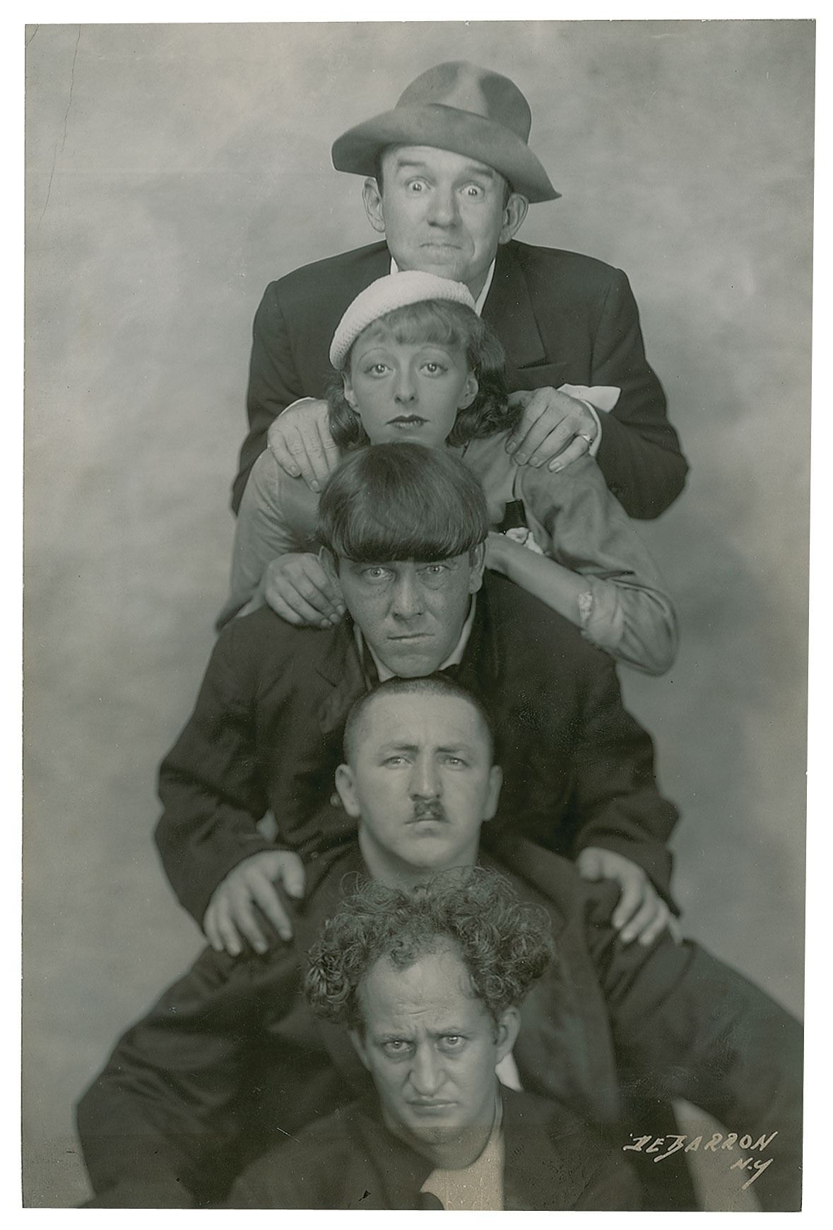 Incredible vintage original 8 x 12.25 pearl-finish photo of Ted Healy and his wife Betty playfully posing with Moe Howard, Curly Howard, and Larry Fine, as taken by DeBarron Studios of New York, with reverse bearing the studio's credit stamp. Reverse is also stamp-dated November 7, 1932. In very good to fine condition, with some light creases and surface impressions.