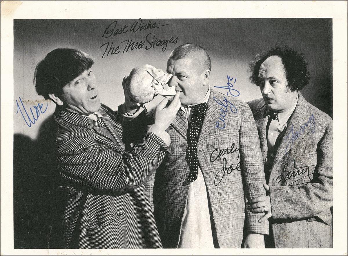 Vintage 7.25 x 5.25 photo of Moe and Larry giving Curly an up-close anatomy lesson, signed in blue ballpoint, “Moe,” “Larry,” and “Curly-Joe.” Photo also bears a pre-printed sentiment and signatures of Moe, Larry, and Curly Joe. Small tear to bottom edge, and scattered light soiling and surface marks, otherwise fine condition. Pre-certified PSA/DNA and RRAuction COA.