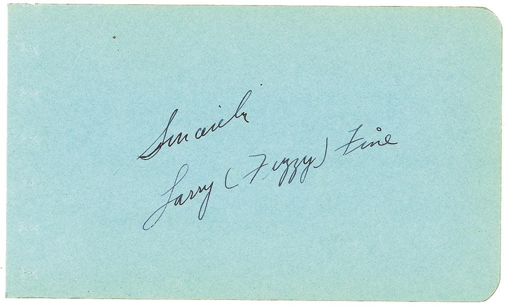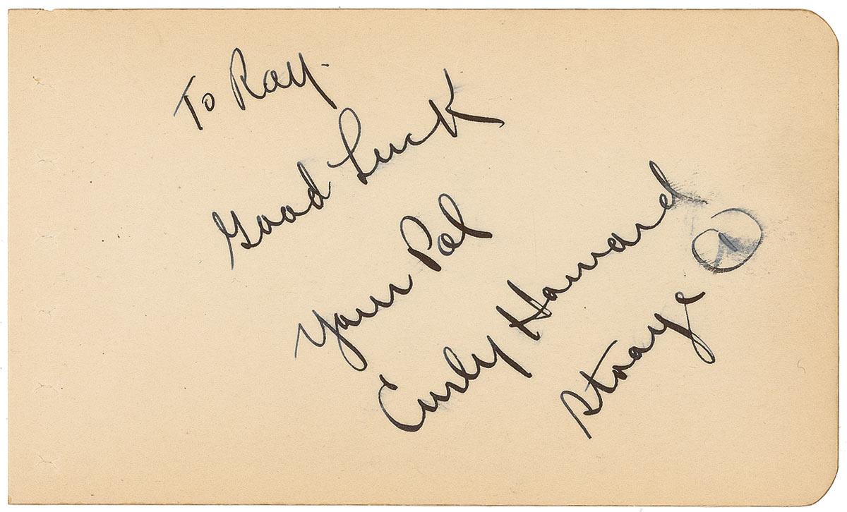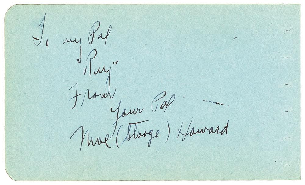 Vintage ink signatures, “To my pal Ray from your pal Moe (Stooge) Howard” and “Sincerely, Larry (Fuzzy) Fine,” on opposite sides of the same blue 5.75 x 3.5 album page; and a vintage ink signature, “To Ray, Good luck, Your pal, Curly Howard, Stooge,” on a similar pale yellow page. A hint of subtle toning, and some light brushing to end of Curly’s signature, otherwise fine condition. Nice bold examples of this trio’s most popular and desirable line-up! Pre-certified PSA/DNA and RRAuction COA.