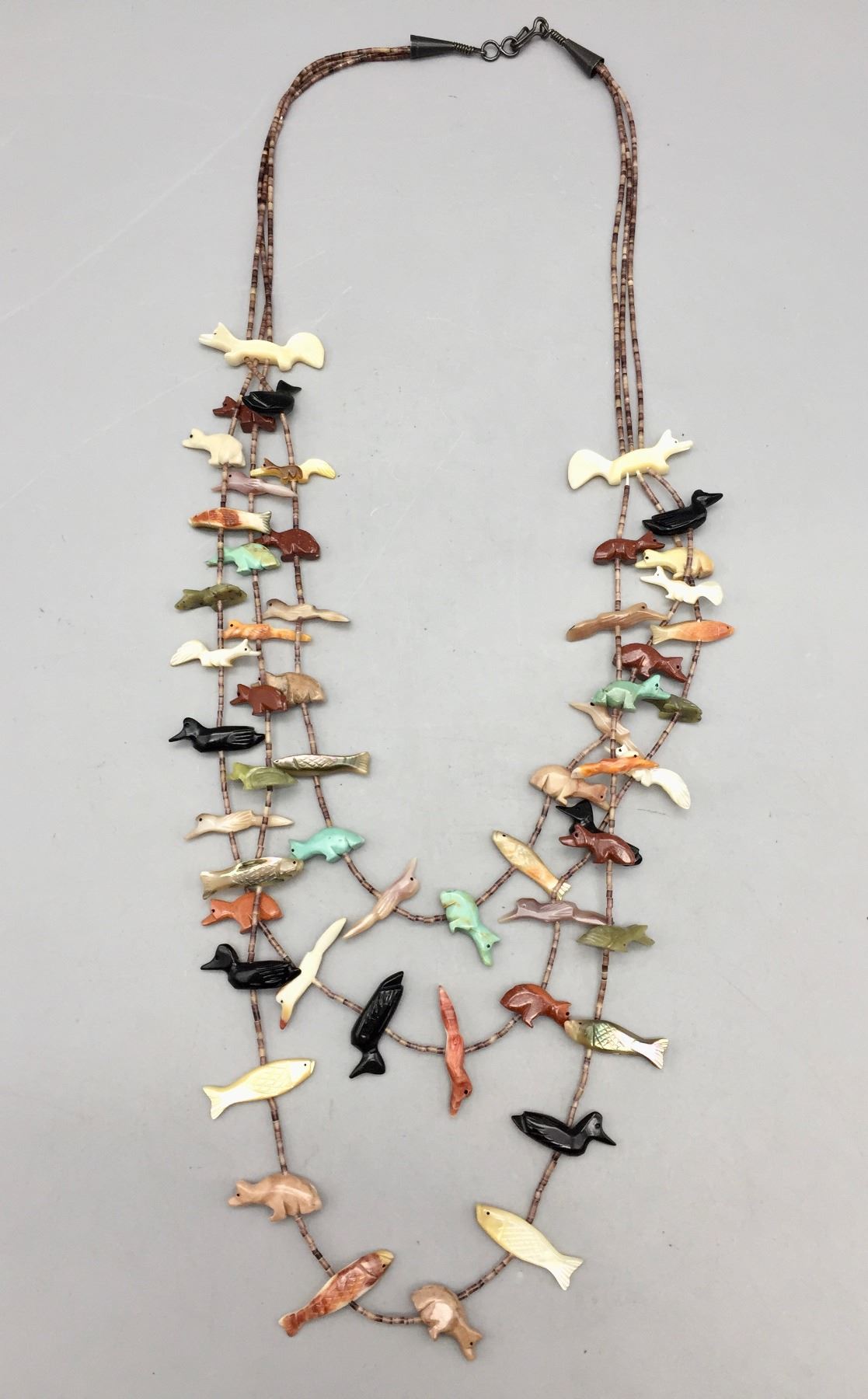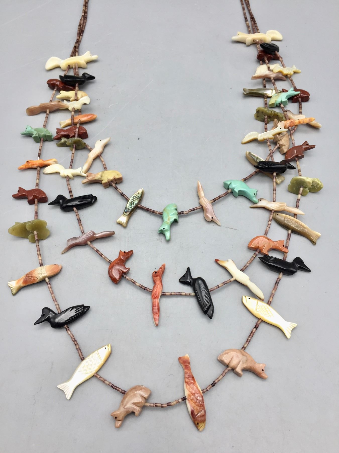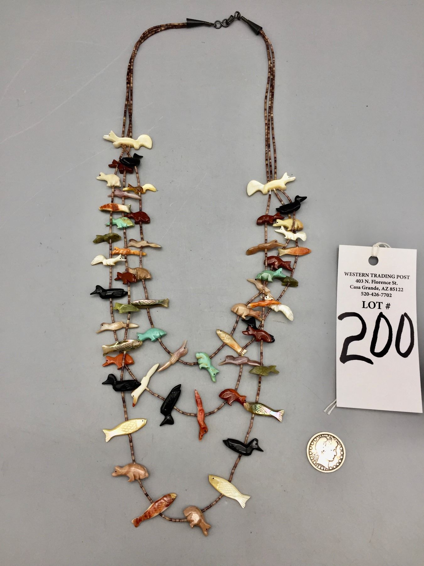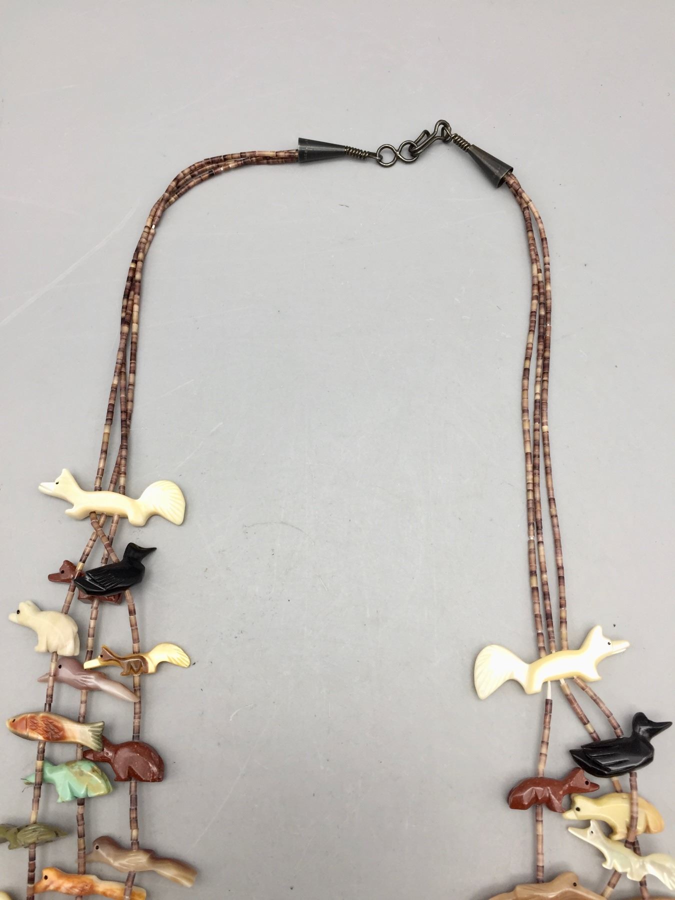 Description: Presented for sale in this lot is a three strand animal fetish necklace with fine Heishi between the fetish figures. Has sterling silver findings. Maker: Unknown. Approx. Age: Circa 1970s. Size: Fits a 25” neck. Weighs 60.2 grams. Condition: Good for its age, normal wear expected. Please look closely at the pictures - they are an important part of our description. Shipping: There will be a $5 handling / packaging fee for shipping this lot. The actual cost of postage will be added on top of that.
