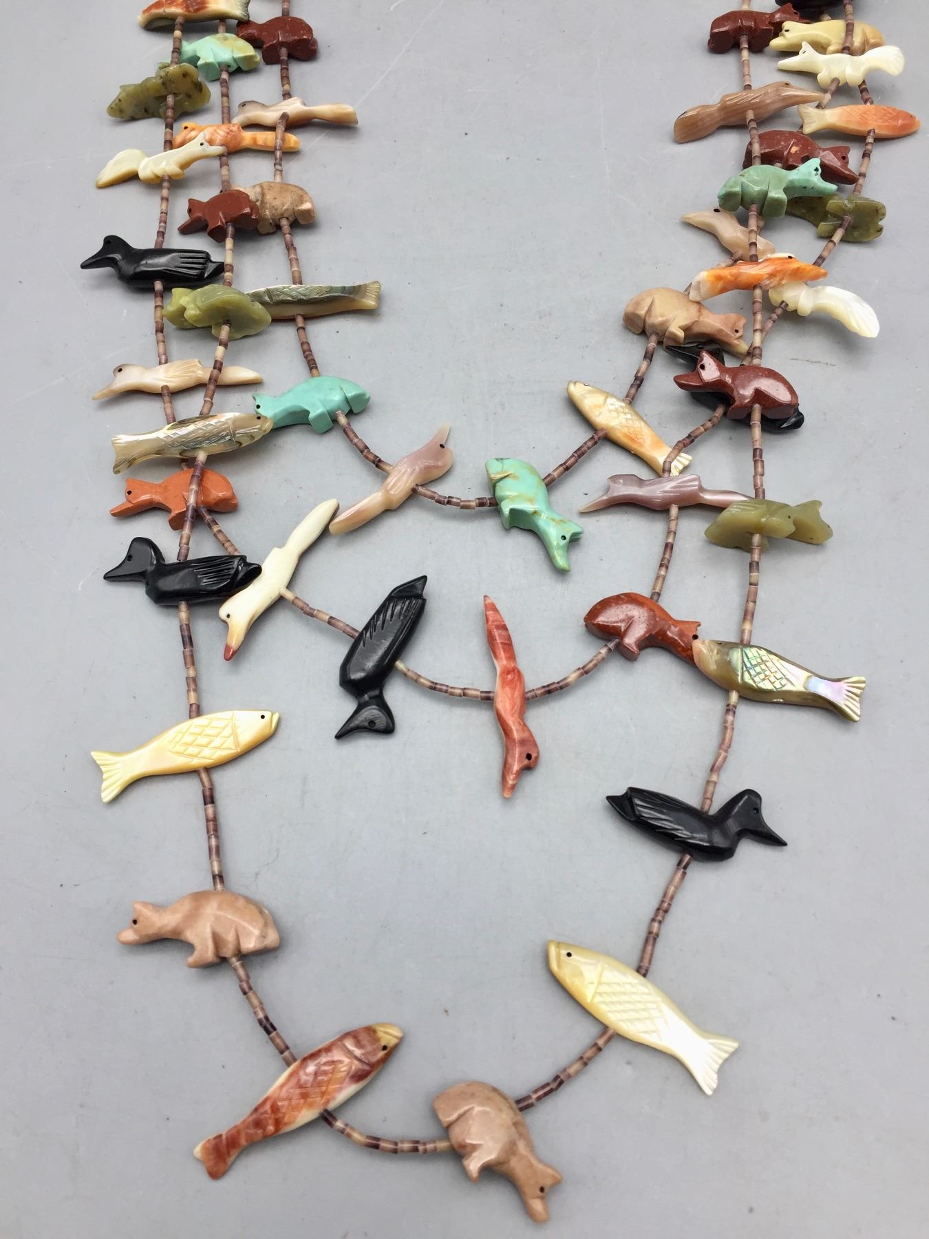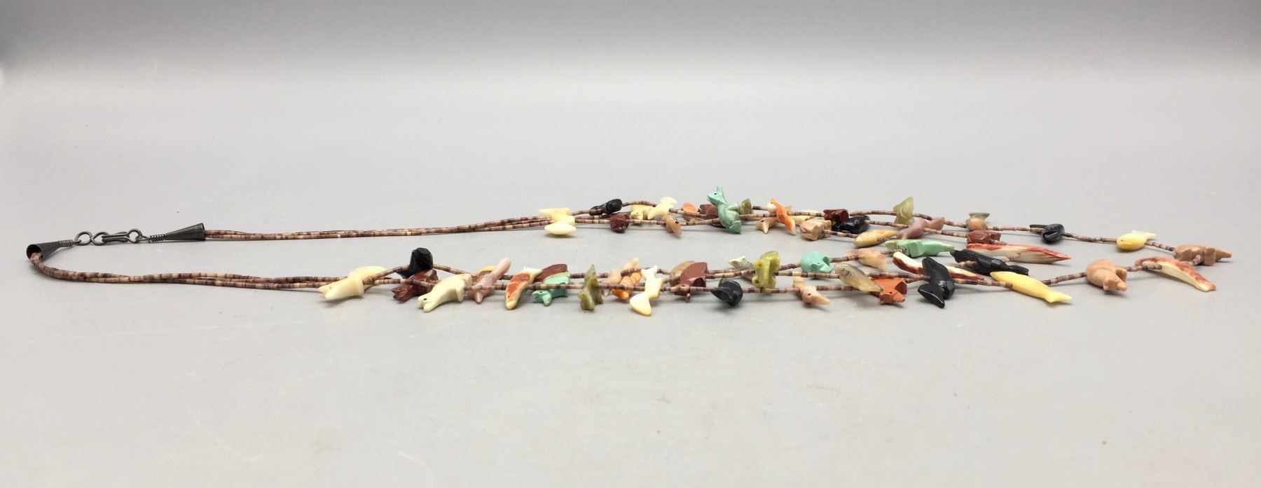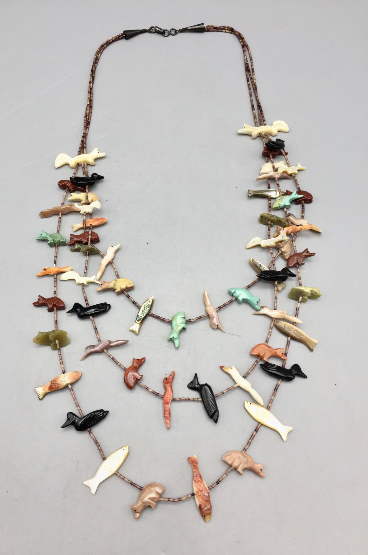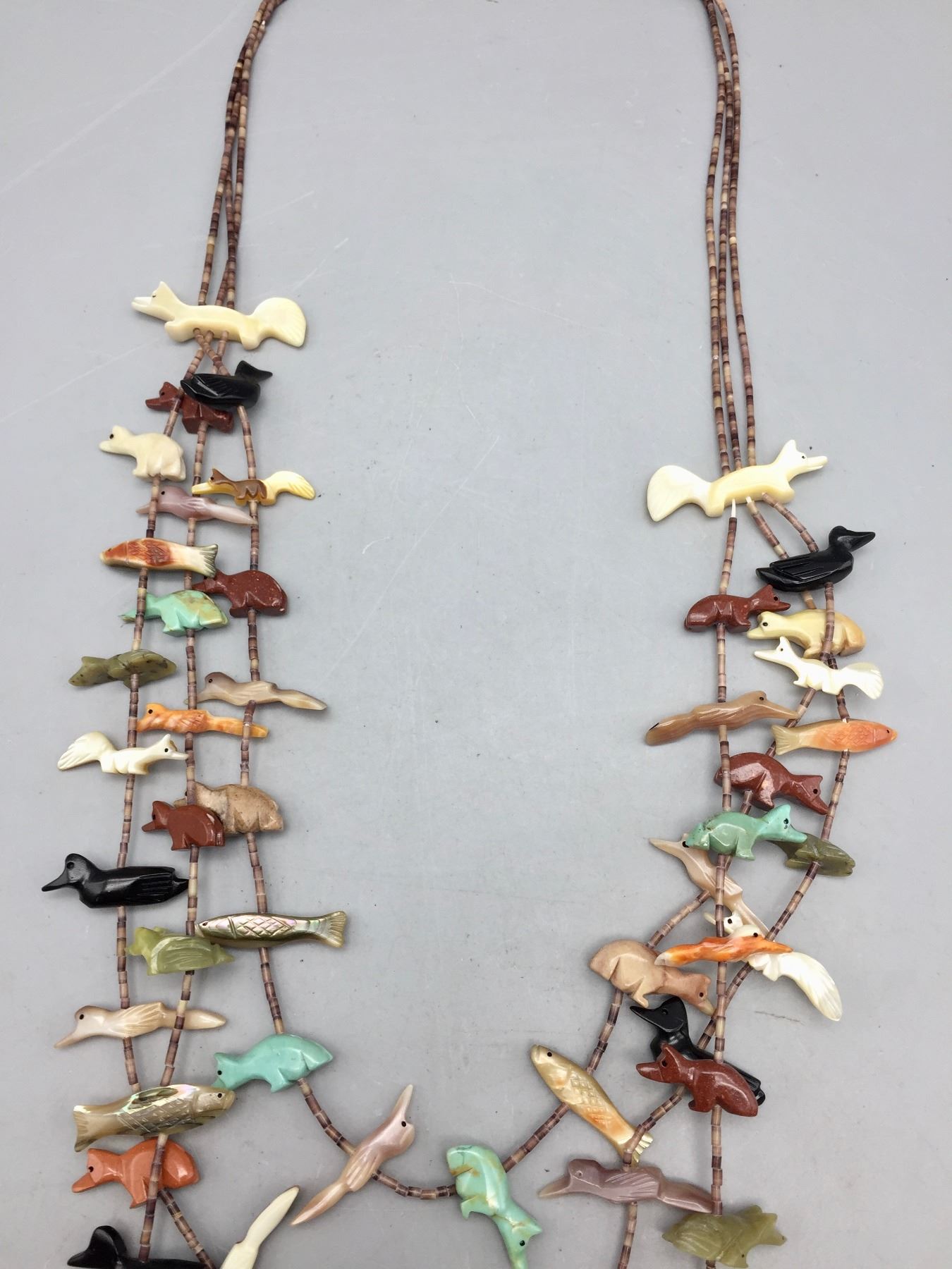 Description: Presented for sale in this lot is a three strand animal fetish necklace with fine Heishi between the fetish figures. Has sterling silver findings. Maker: Unknown. Approx. Age: Circa 1970s. Size: Fits a 25” neck. Weighs 60.2 grams. Condition: Good for its age, normal wear expected. Please look closely at the pictures - they are an important part of our description. Shipping: There will be a $5 handling / packaging fee for shipping this lot. The actual cost of postage will be added on top of that.