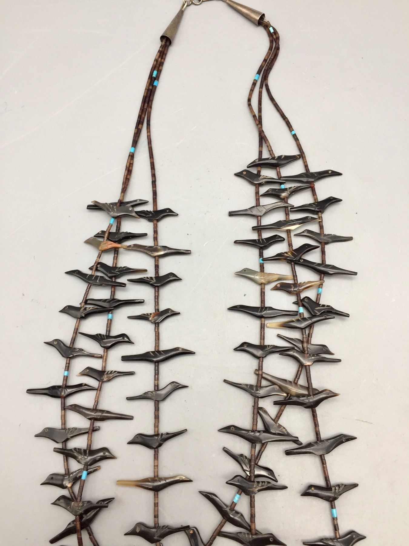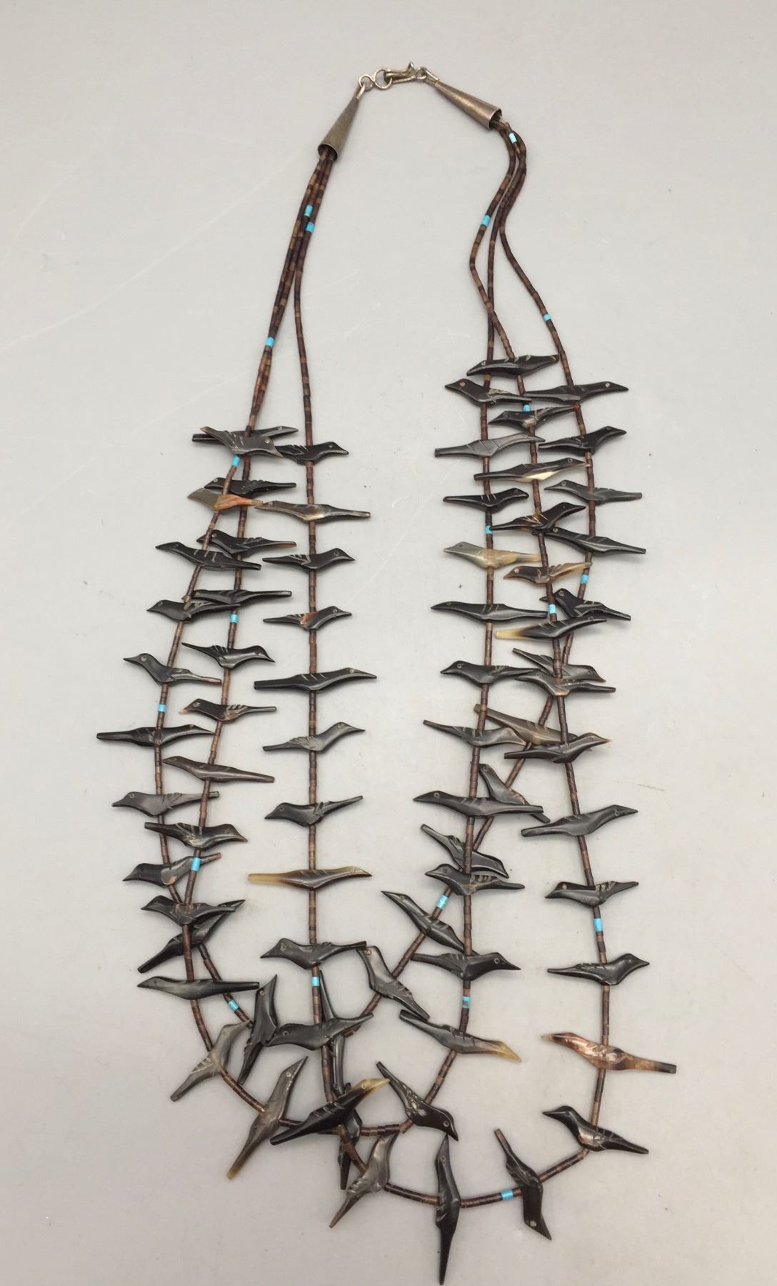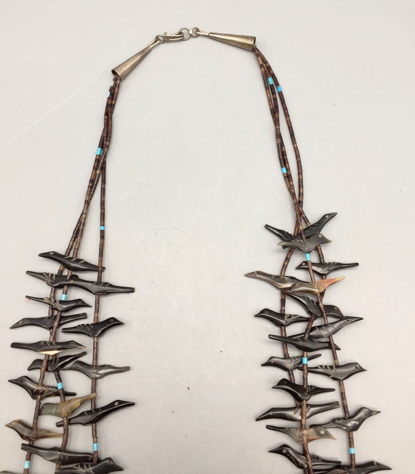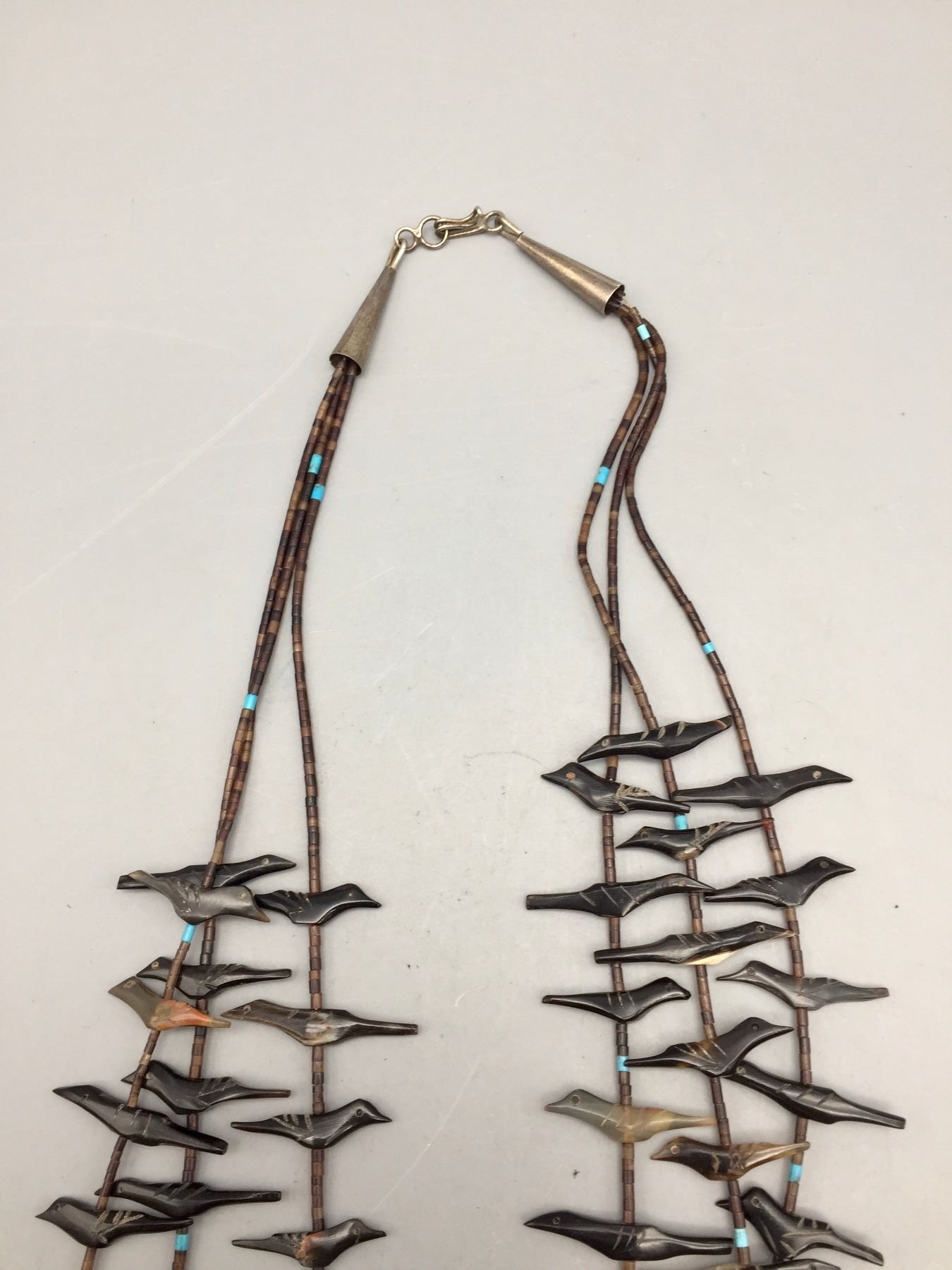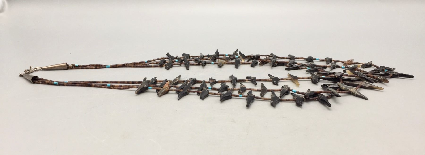 Description: Featured for sale in this lot is a three strand bird fetish necklace with what appears to be Penn Shell and possibly Tortoise Shell with some turquoise accents with sterling silver findings. Maker: Unknown. Approx. Age: Circa 1970s vintage. Size: Fits a 25” neck. Weighs 42.4 grams. Condition: Good for its age, normal wear expected. Please look closely at the pictures - they are an important part of our description. Shipping: There will be a $5 handling / packaging fee for shipping this lot. The actual cost of postage will be added on top of that.