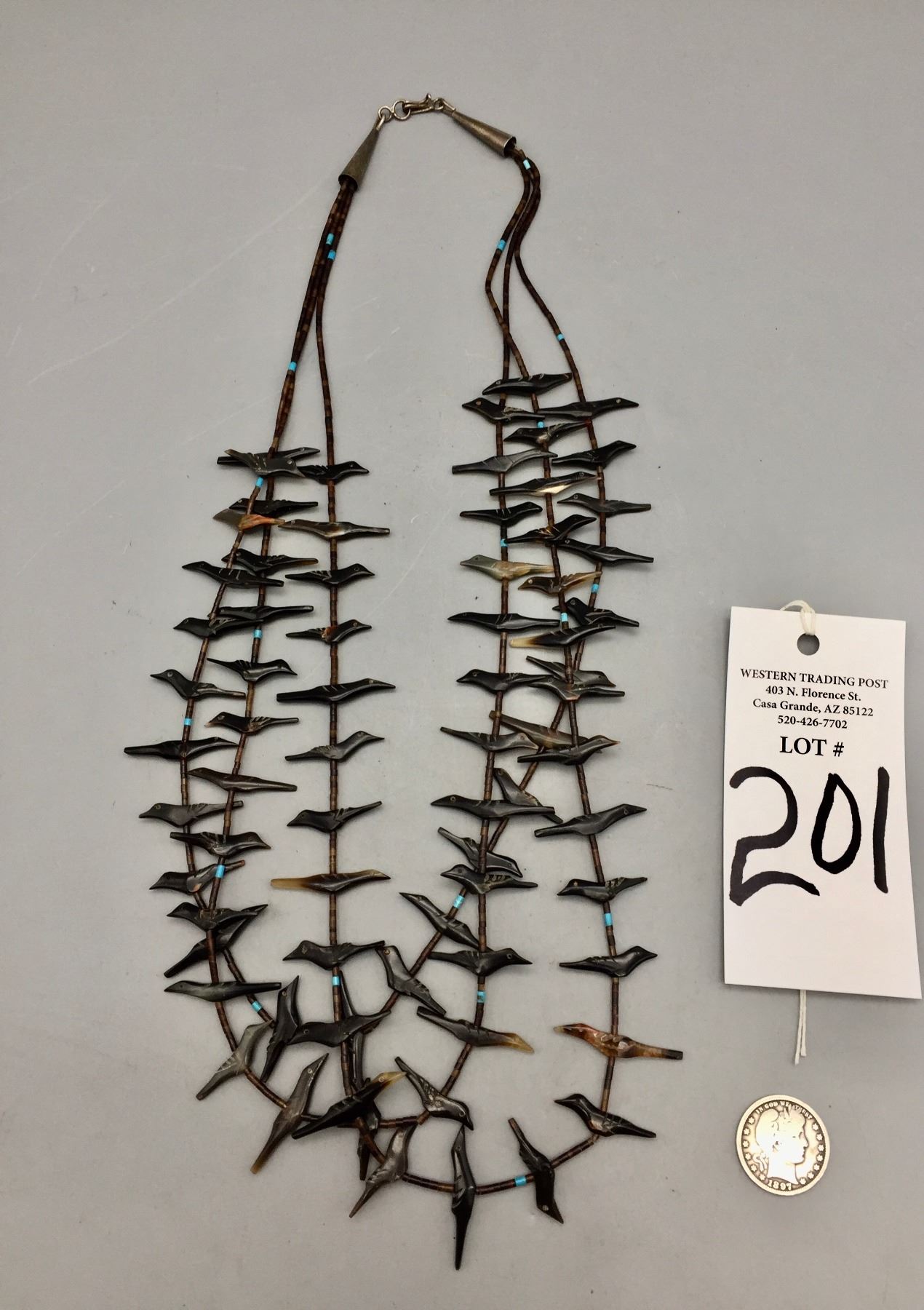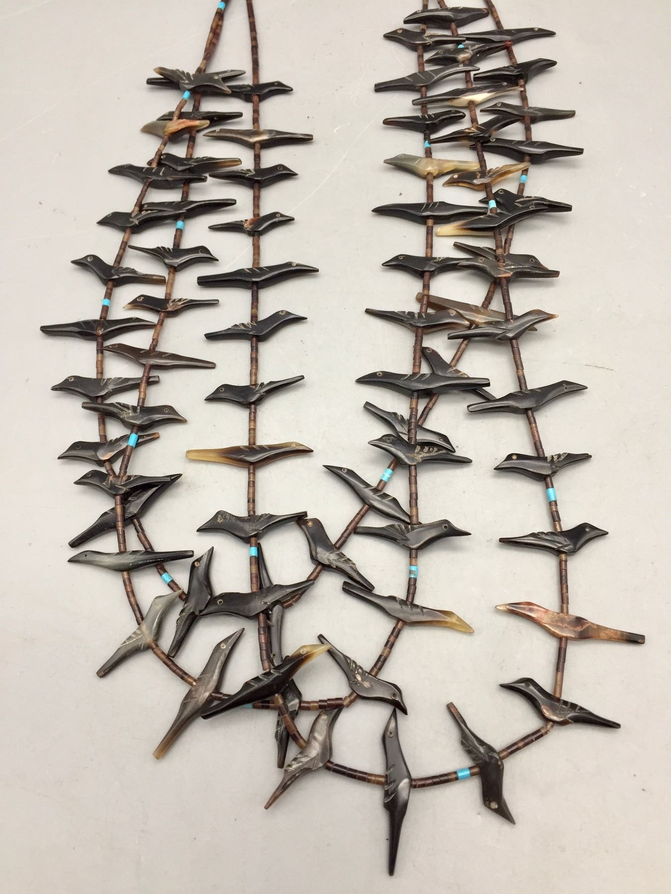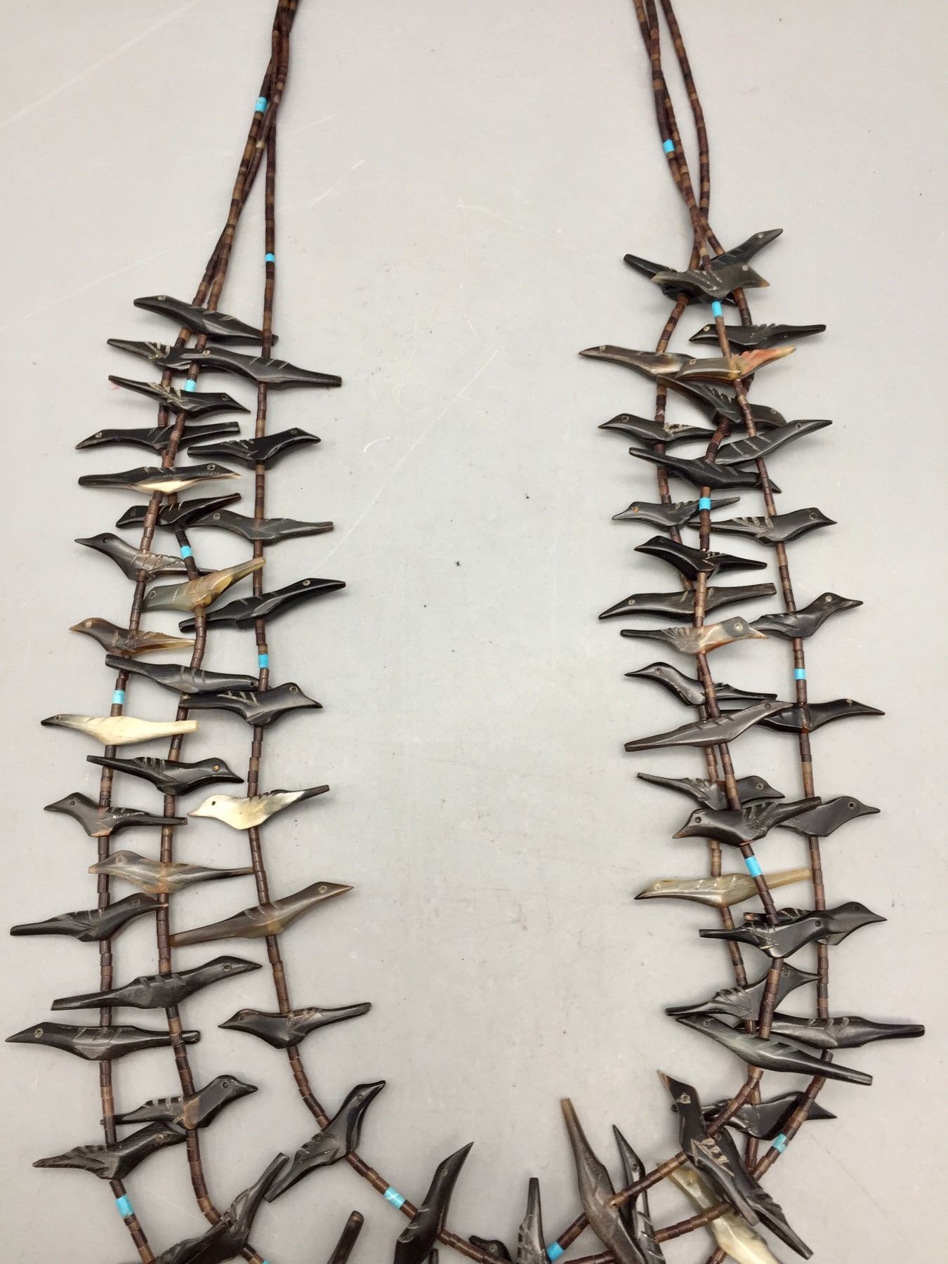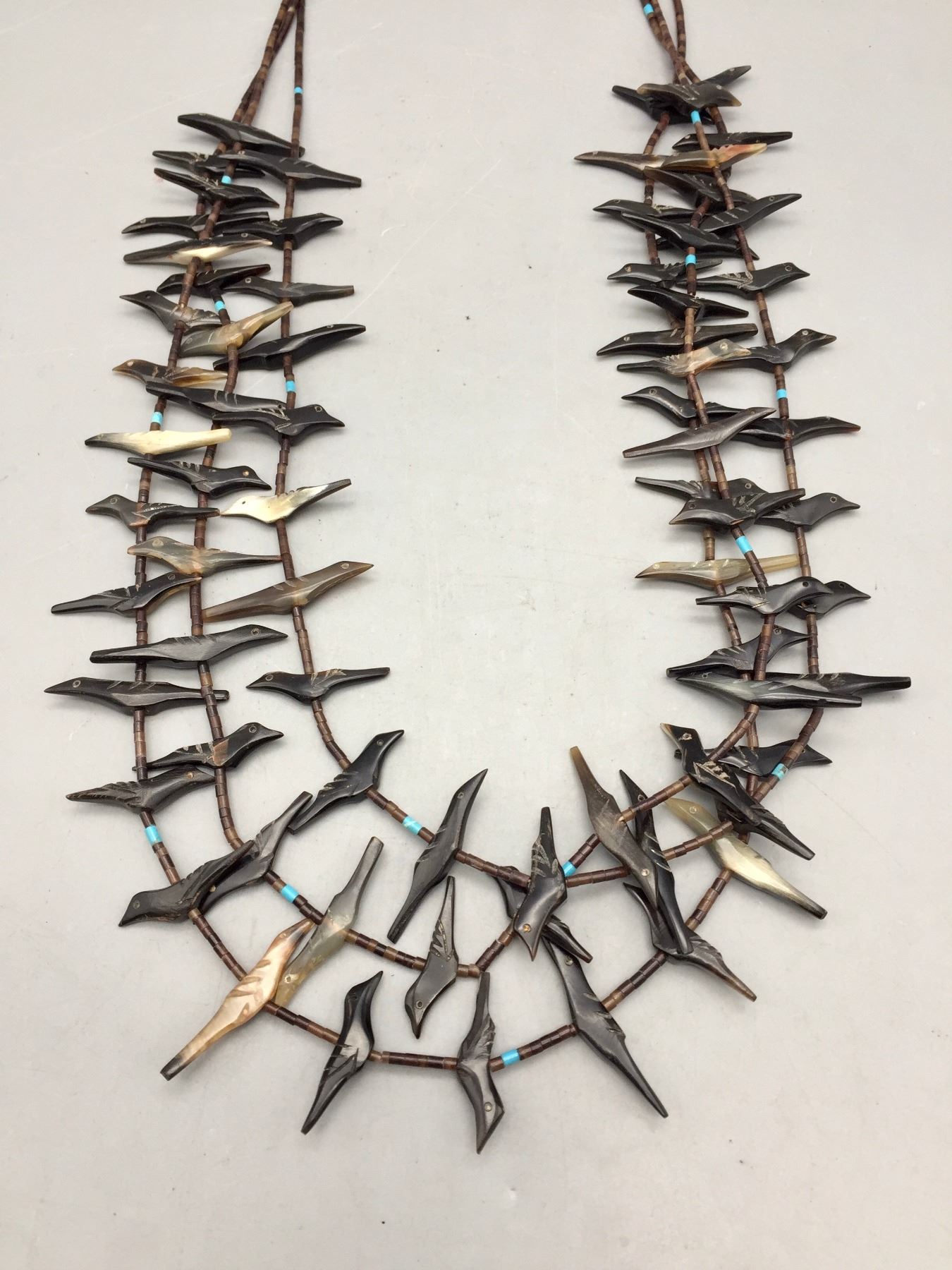 Description: Featured for sale in this lot is a three strand bird fetish necklace with what appears to be Penn Shell and possibly Tortoise Shell with some turquoise accents with sterling silver findings. Maker: Unknown. Approx. Age: Circa 1970s vintage. Size: Fits a 25” neck. Weighs 42.4 grams. Condition: Good for its age, normal wear expected. Please look closely at the pictures - they are an important part of our description. Shipping: There will be a $5 handling / packaging fee for shipping this lot. The actual cost of postage will be added on top of that.