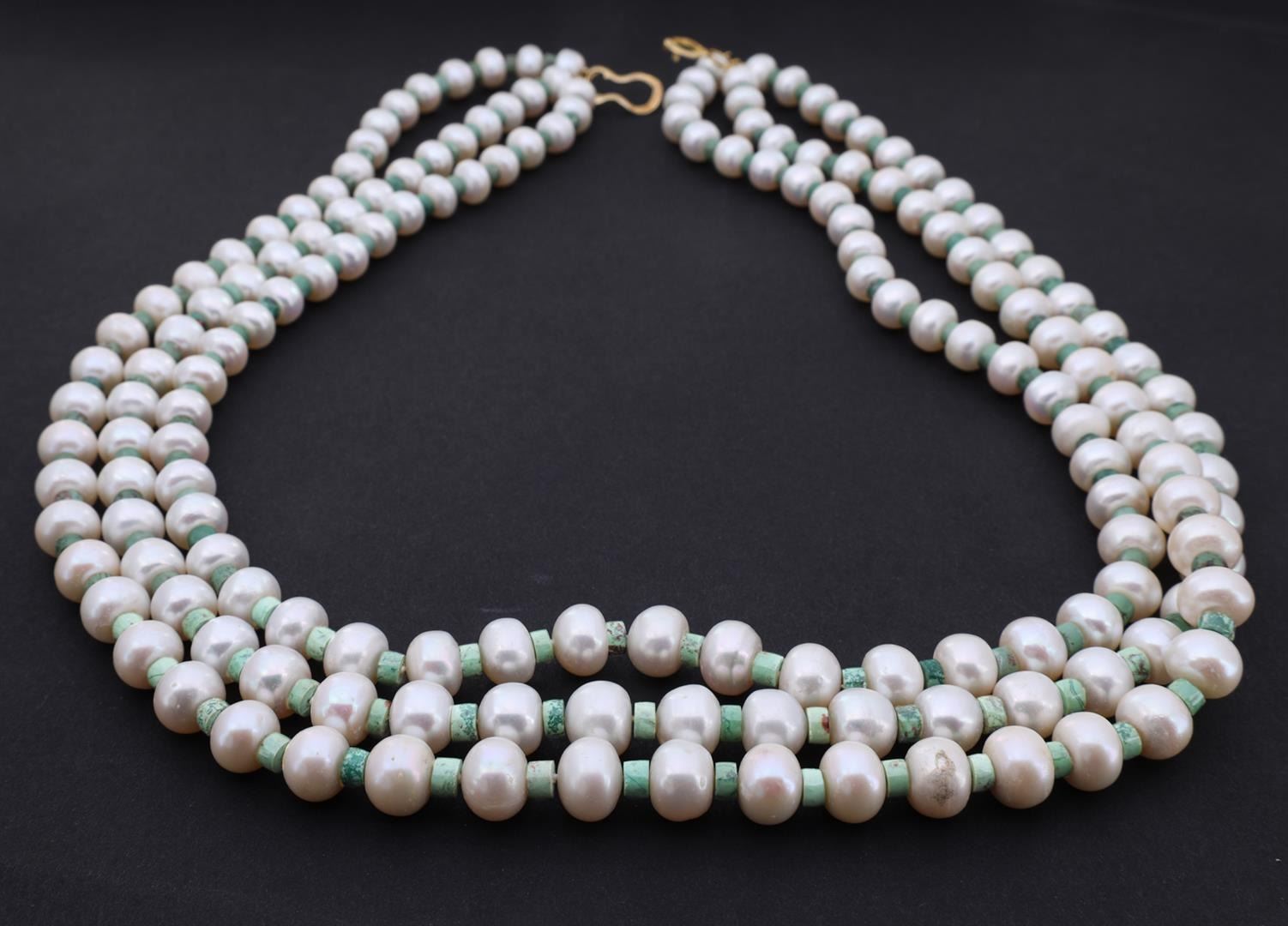 Three-Strand Pearl & Antique Peruvian Bead Necklace. Total weight is 193 gm. Estimated retail value $1,000.