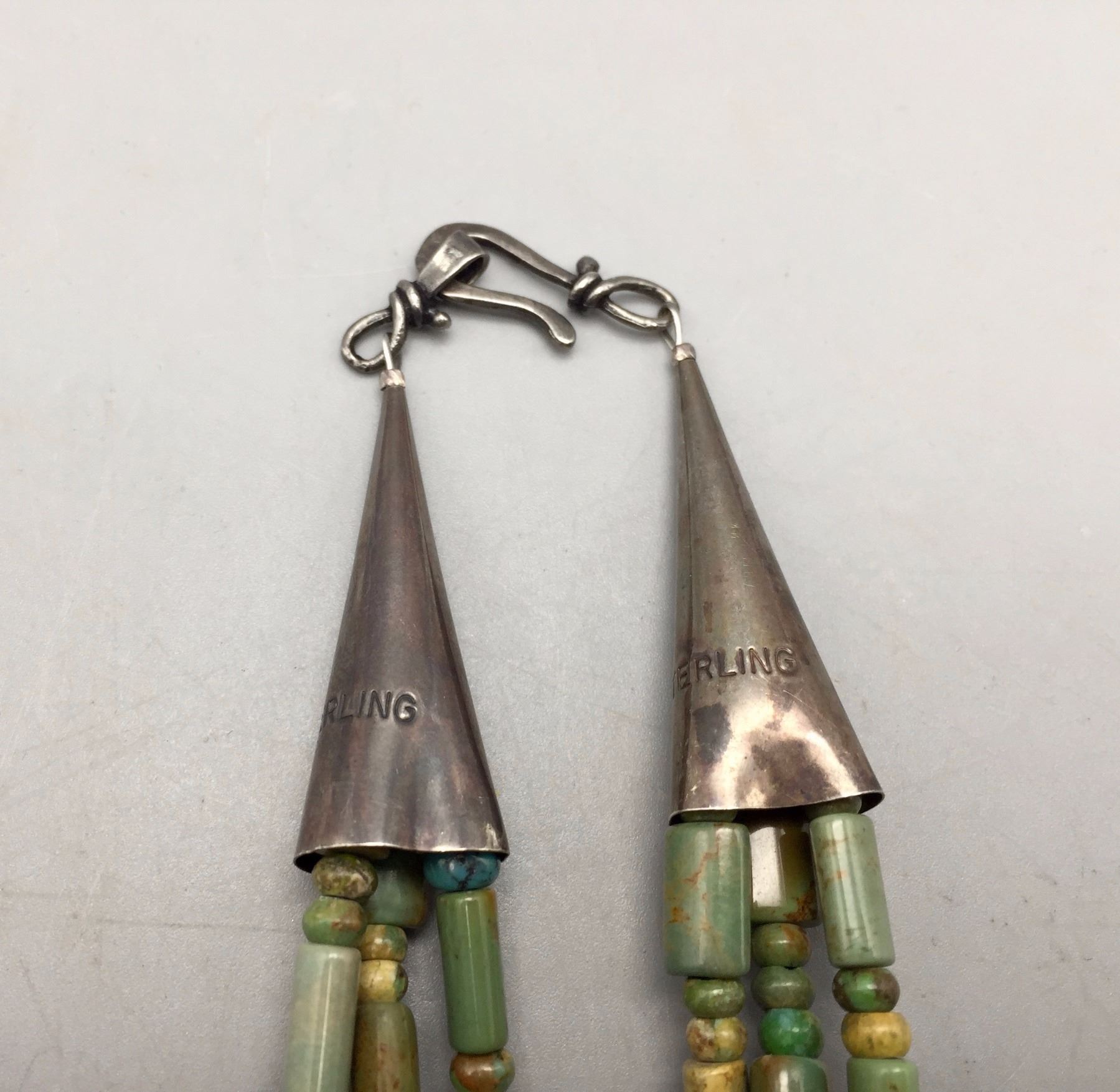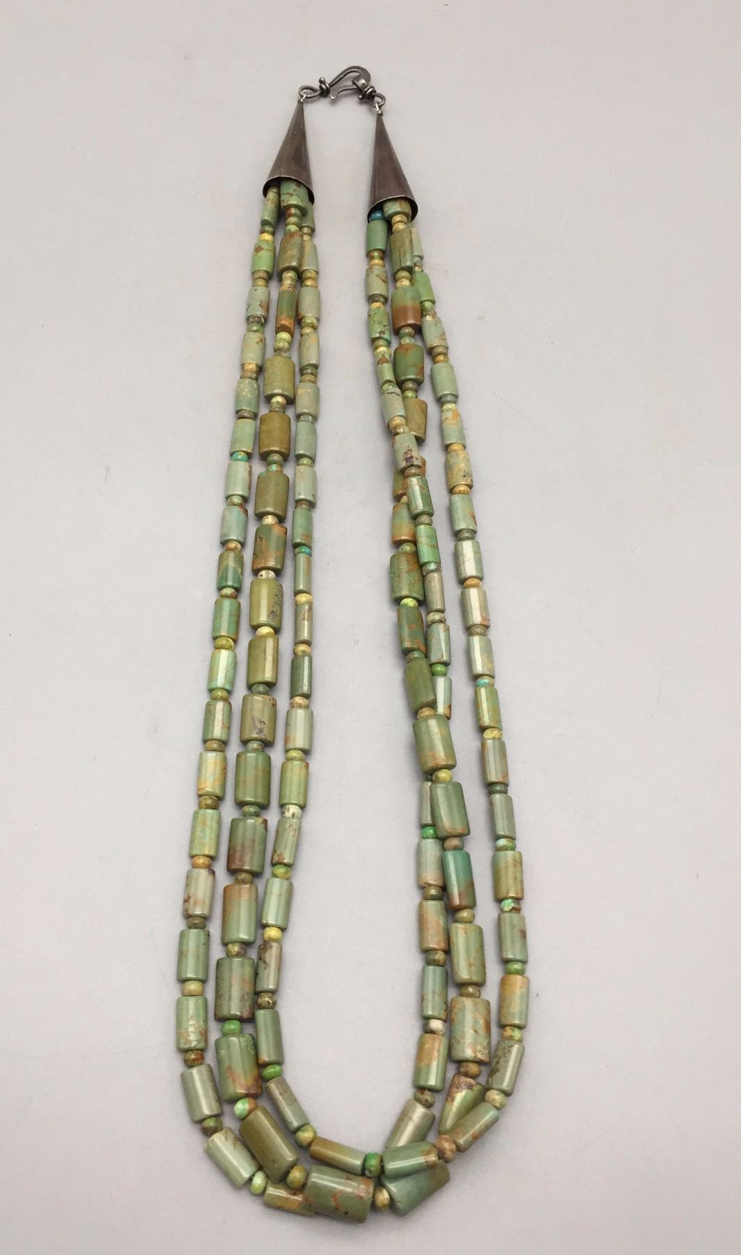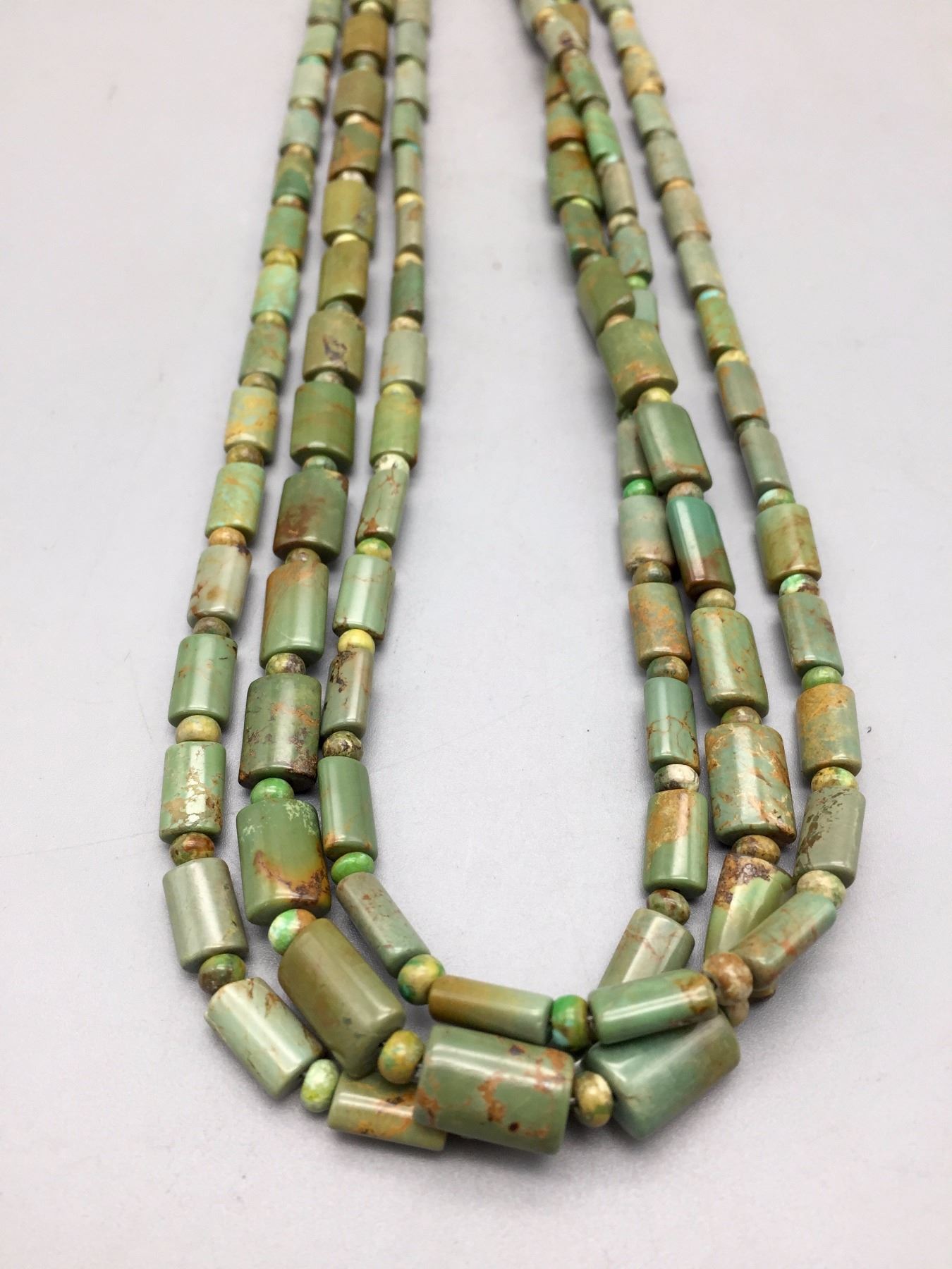 Description: Nice, three strand turquoise necklace with sterling silver findings. Maker: Unknown, no hallmark. Approx. Age: Vintage. Size: necklace measures 24” around the neck and weighs 78.7 g. Condition: Good for its age, normal wear expected. Please look closely at the pictures - they are an important part of our description. Shipping: There will be a $5 handling / packaging fee for shipping this lot. The actual cost of postage will be added on top of that.