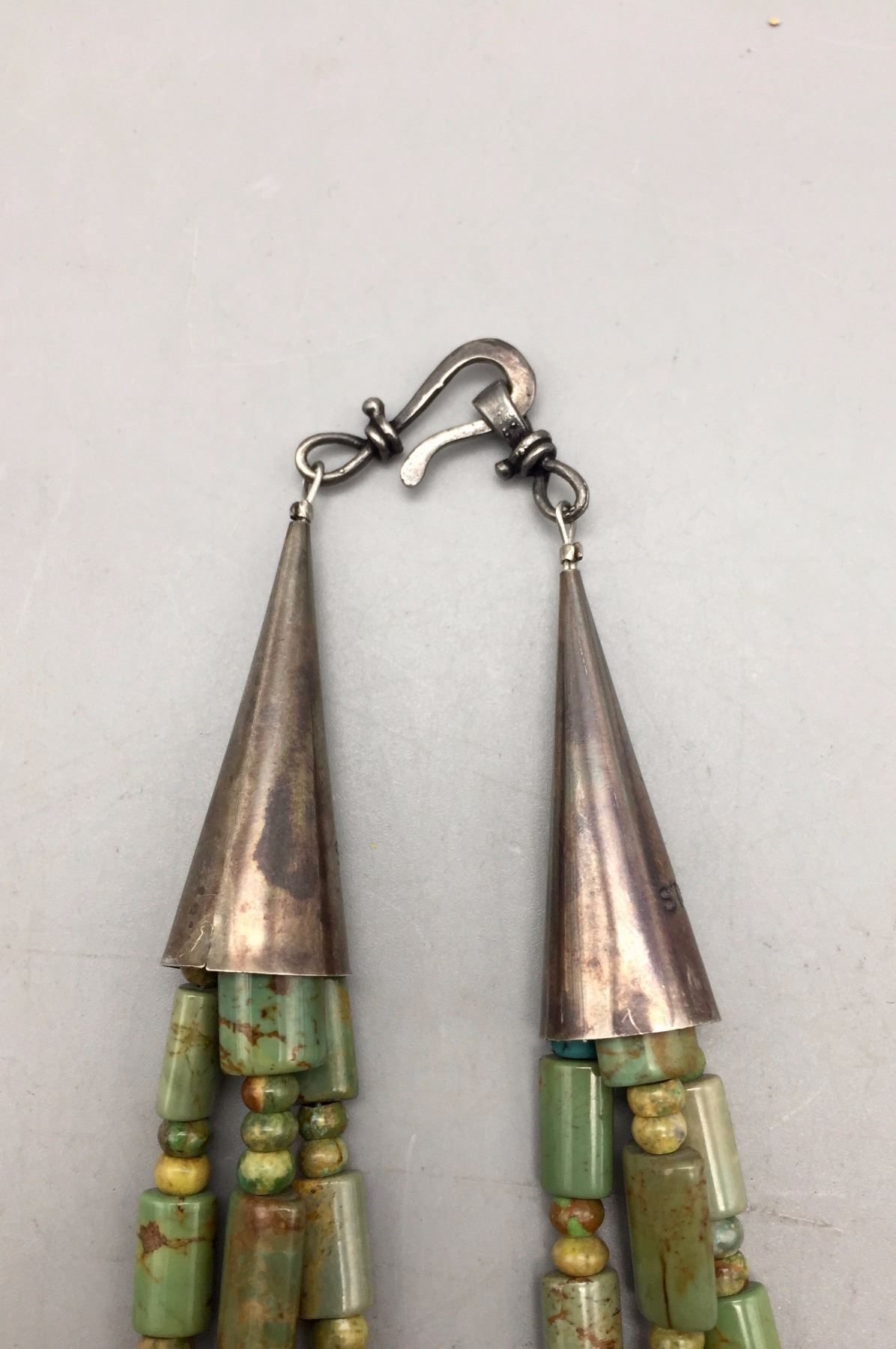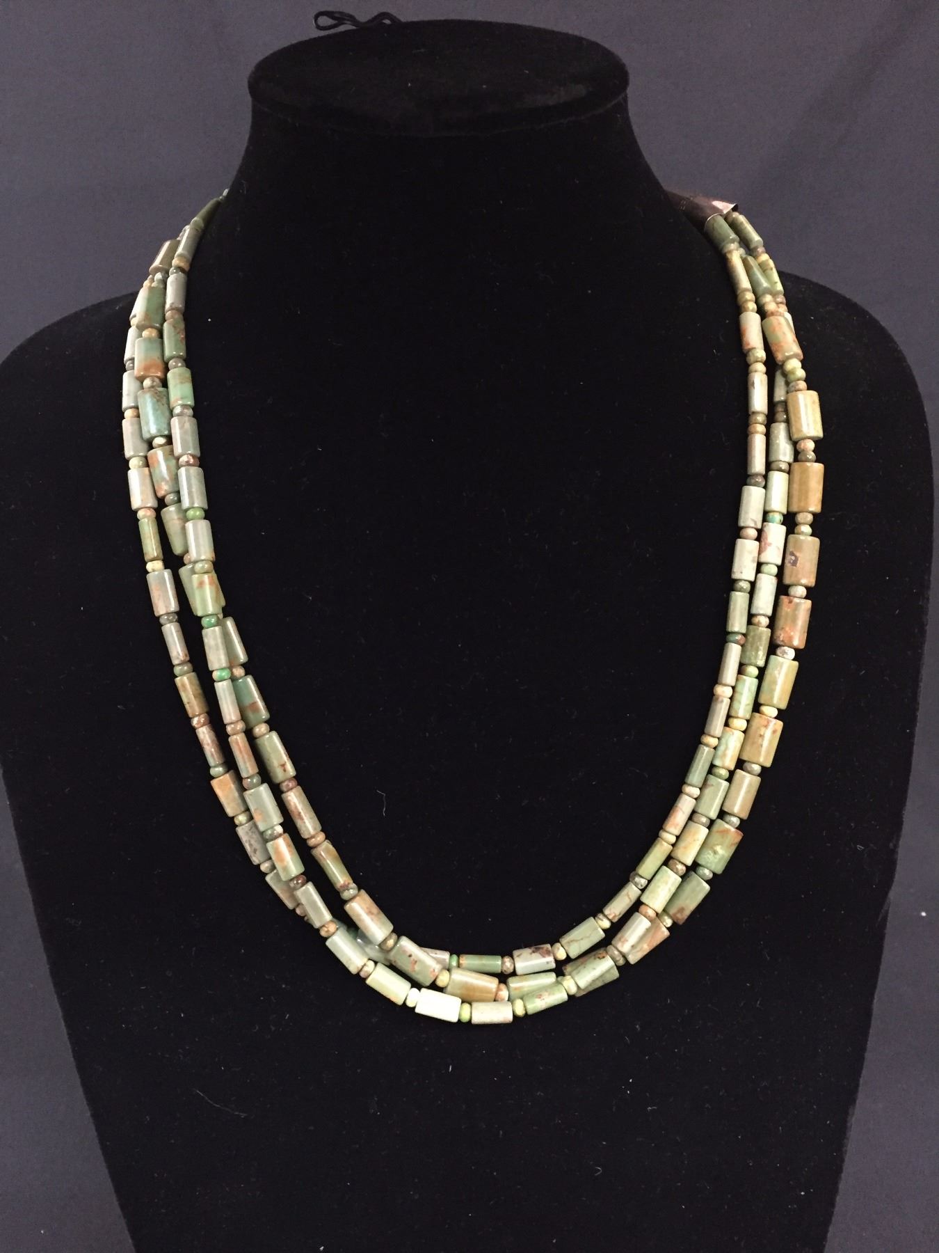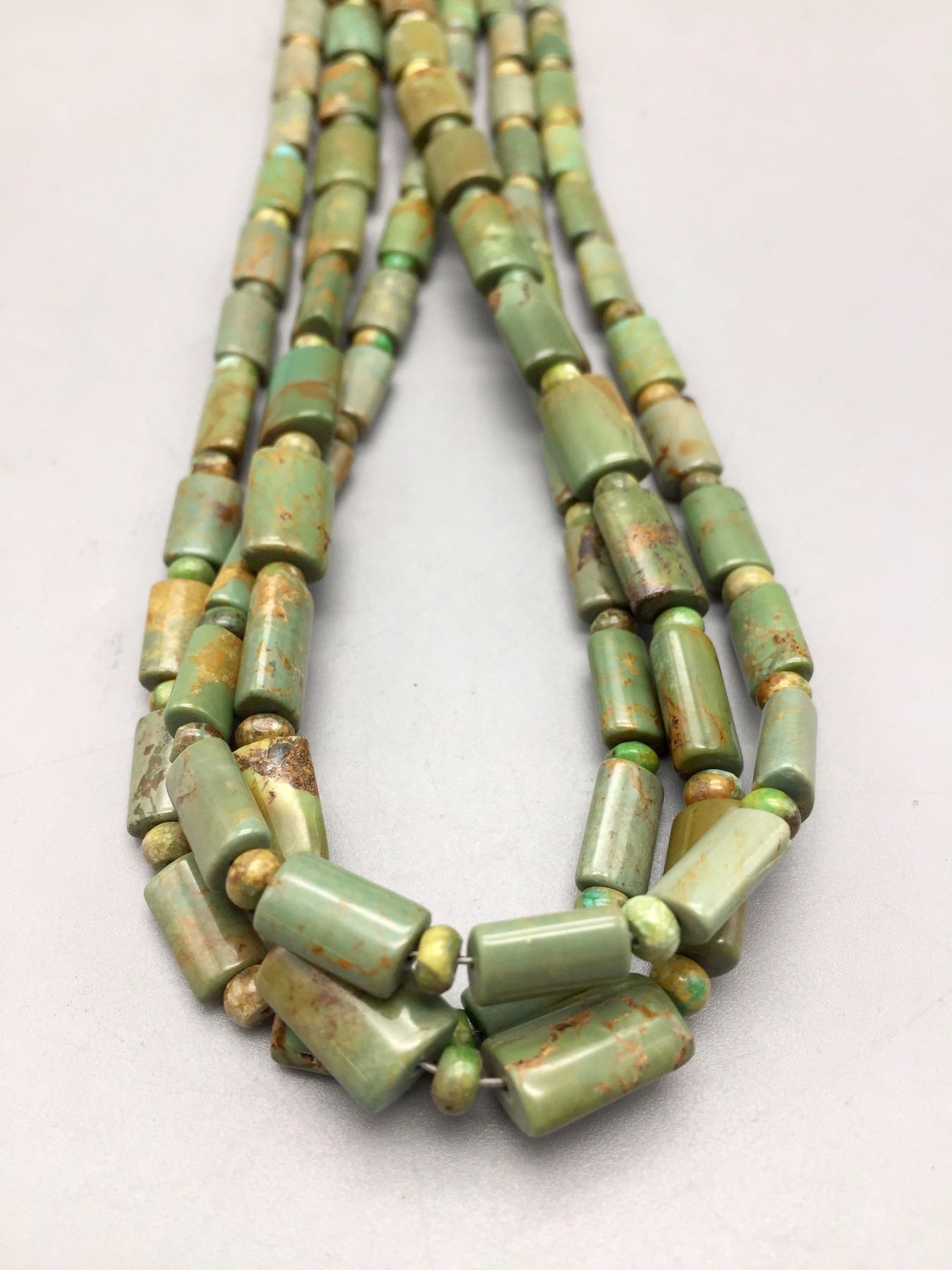 Description: Nice, three strand turquoise necklace with sterling silver findings. Maker: Unknown, no hallmark. Approx. Age: Vintage. Size: necklace measures 24” around the neck and weighs 78.7 g. Condition: Good for its age, normal wear expected. Please look closely at the pictures - they are an important part of our description. Shipping: There will be a $5 handling / packaging fee for shipping this lot. The actual cost of postage will be added on top of that.