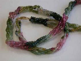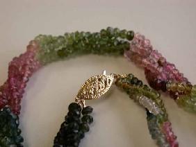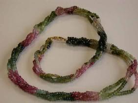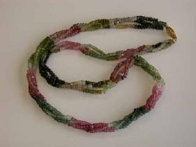 Three Strands Tourmaline Necklace with 14ky gold Clasp and the length is approximately 18 inches long