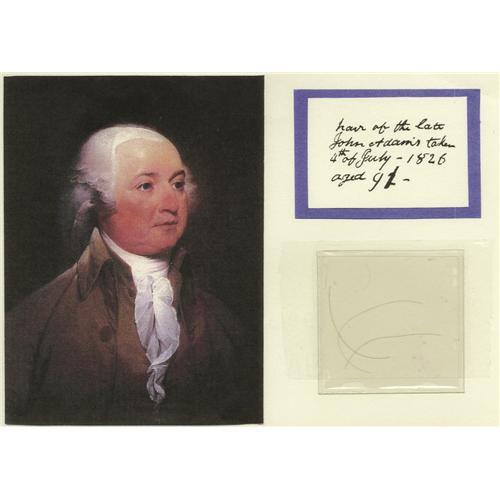 <B>Three Strands of Hair of John Adams</B></I> mounted beneath a facsimile copy of the provenance documenting the hair reading: "hair of the late John Adam's taken 4th of July - 1826 aged 91". With Certificate of Authenticity from University Archives and other documentation of provenance.<BR><BR><b>Shipping:</b> Books & Catalogs (<a target="_blank" href="http://www.heritageauctions.com/common/shipping.php">view shipping information</a>)