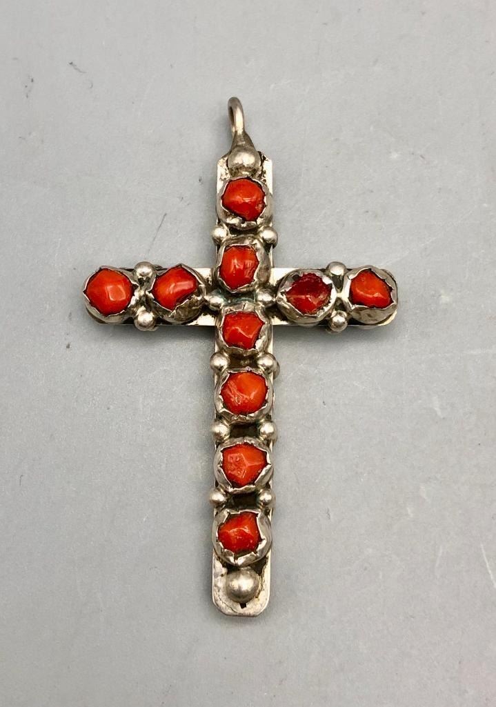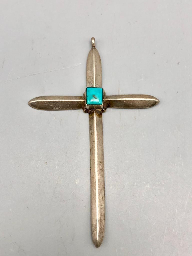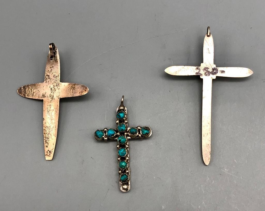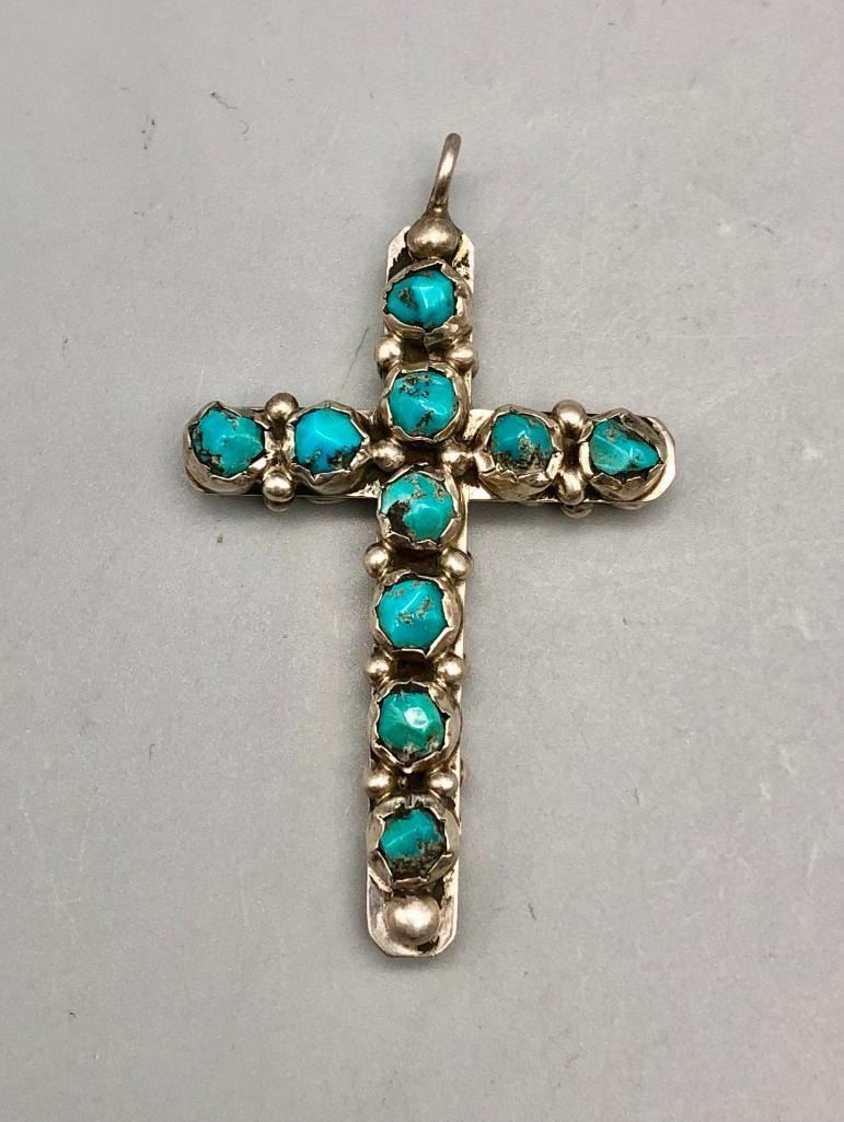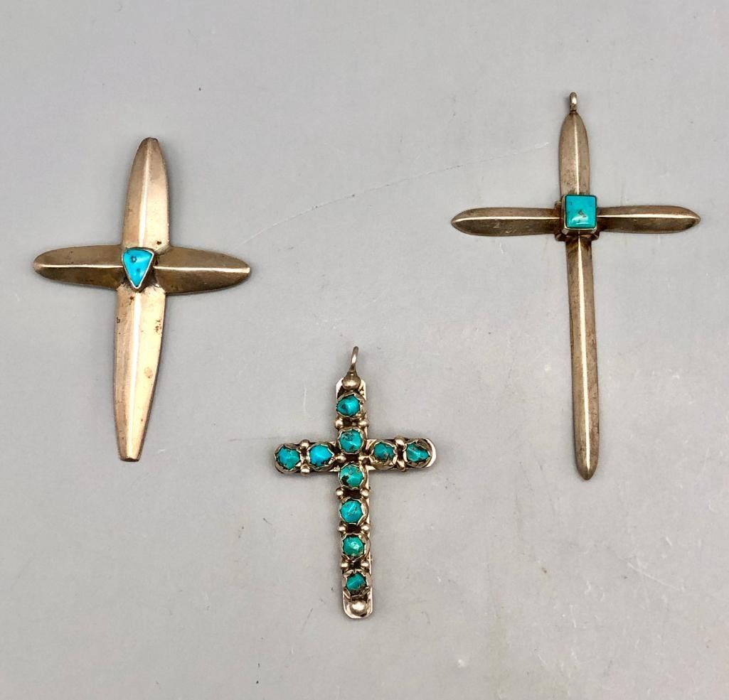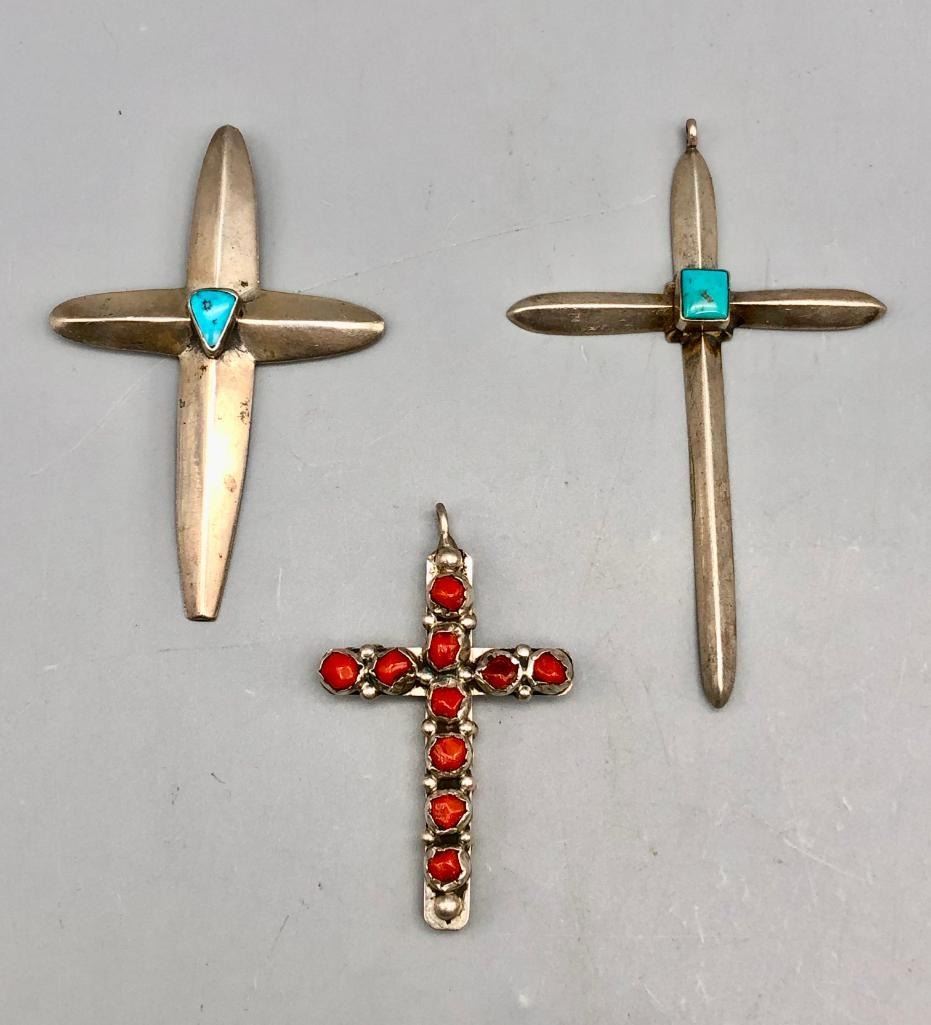 Up for consideration are three SUPER cross pendants. Two pendants are sandcast cross pendants set with nice turquoise stones. The third cross is a drool worthy piece, because it is a double sided cross pendant set with coral and turquoise. All three are various sizes and styles and are made from sterling silver. MAKER: Unmarked. APPROX AGE: Vintage. SIZE: Various. Combined weight is 62.9 grams. CONDITION: Good for their age, normal wear expected. Please look closely at the pictures as they are an important part of our description and are hereby incorporated into the description, specifically with regards to condition. SHIPPING: There will be a $5 handling / packaging fee for shipping this lot. The actual cost of postage will be added on top of that. BUY IT NOW: If you would like to buy this item now, without waiting for the auction day to bid on it, we do offer this option (which is available up to 48 hours before the actual auction starts). The “Buy it Now†price is the high estimate of this lot (plus applicable fees and the Buyer's premium is discounted to 10% when using the Buy it Now option). If you would like to exercise this option, you must contact us by email (or phone as long as you talk to someone live). Reference this lot number and your intention to "Buy it Now."