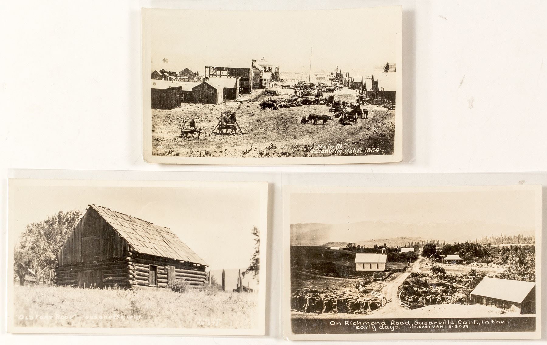 Three RPPCs. Two are reprints (c.1940s) of early Susanville views: Main Street in 1864 and "On Richmond Road in the Early Days" (JH Eastman). Third card shows "Old Fort Roop" ( also by JH Eastman). All three unmailed. (Prag Collection) State: California City: Susanville HWAC#: 34941 Date: