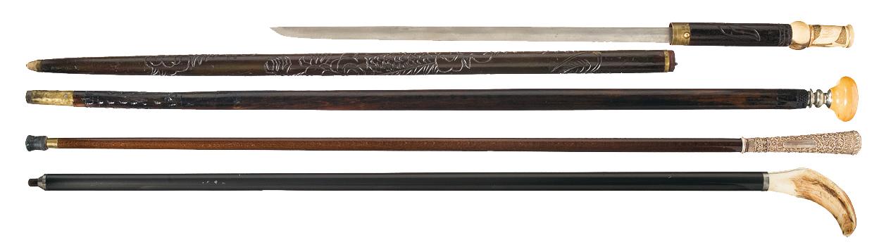 1) Ivory topped sword cane, 38" total length with brass tip, 1 1/10" thick hardwood shaft with carved dragon designs, and 3" long horn and carved ivory head with gold paint and scrimshaw accents. Brass collar with spring loaded retainer, revealing a 19" single edged sword blade, unmarked. 2) Horn topped sword cane, 34 1/2" total length, iron and brass tip, 9/10" thick hardwood shaft with carved accents, and a 1 9/10" wide horn knob top. Blade is single edged, 22 1/4" long. 3) Silver topped walking stick, 39 1/4" total length, rubber capped brass tip, 2/3" thick hardwood shaft, and a 5 9/10" long cylindrical silver head, with raised floral vine designs, textured backgrounds and an inscription panel with hallmarks on the side. 4) Pat Crawford Custom ivory fitted dagger cane, 35" long, with an iron and nickel tip, 9/10" thick gray painted shaft, and a 4 1/2" long ivory tusk grip. Single edged blade, 8 1/2" long, signed "Crawford" on the left side, with ball detent collar retention.