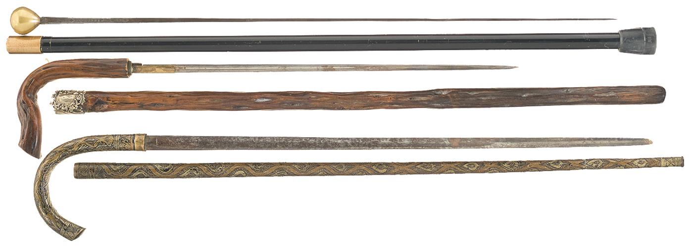 1) Metal sword cane, 34 1/2" tall with a rubber tip, black painted leather body, bronze tip and brass ball top, which doubles as the handle of a 29 3/4" rectangular spike blade. 2) Silver banded walking stick, 25" tall with a natural wood appearance, silver band with twist decoration and "WH" inscribed shield, and an "L" pattern handle, attached to an 18 3/4" cruciform spike. 3) Brass bodied sword cane, 34" long with metal tip, leaf themed engraving and paint accents, hook top with retention button connected to a 24" single edged single fuller blade with light engraving.