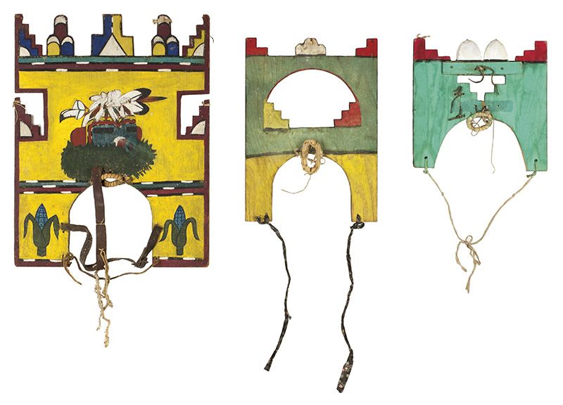 Rio Grande Pueblo | Media: Wood, leather, cloth and string | Dimensions from left to right: 14.5 by 18, 9.5 by 13, 9.5 by 10 inches