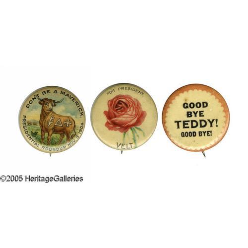 <B>Three Teddy Roosevelt 1 1/4" Pinback Buttons.</B></I> This lot includes the interesting 1904 "Don't Be a Maverick" multicolored novelty button picturing a steer with the Roosevelt brand. Although a New Yorker, Roosevelt traveled to the west and even wrote a book about his experiences as a rancher. This item was issued to show the cattlemen's support of his candidacy and is in excellent condition. Also in this lot is an unusual version of the button picturing only a red rose with "velt" beneath and "For President" above. The third item is from the 1912 election and states simply "Good Bye Teddy! Good Bye!"