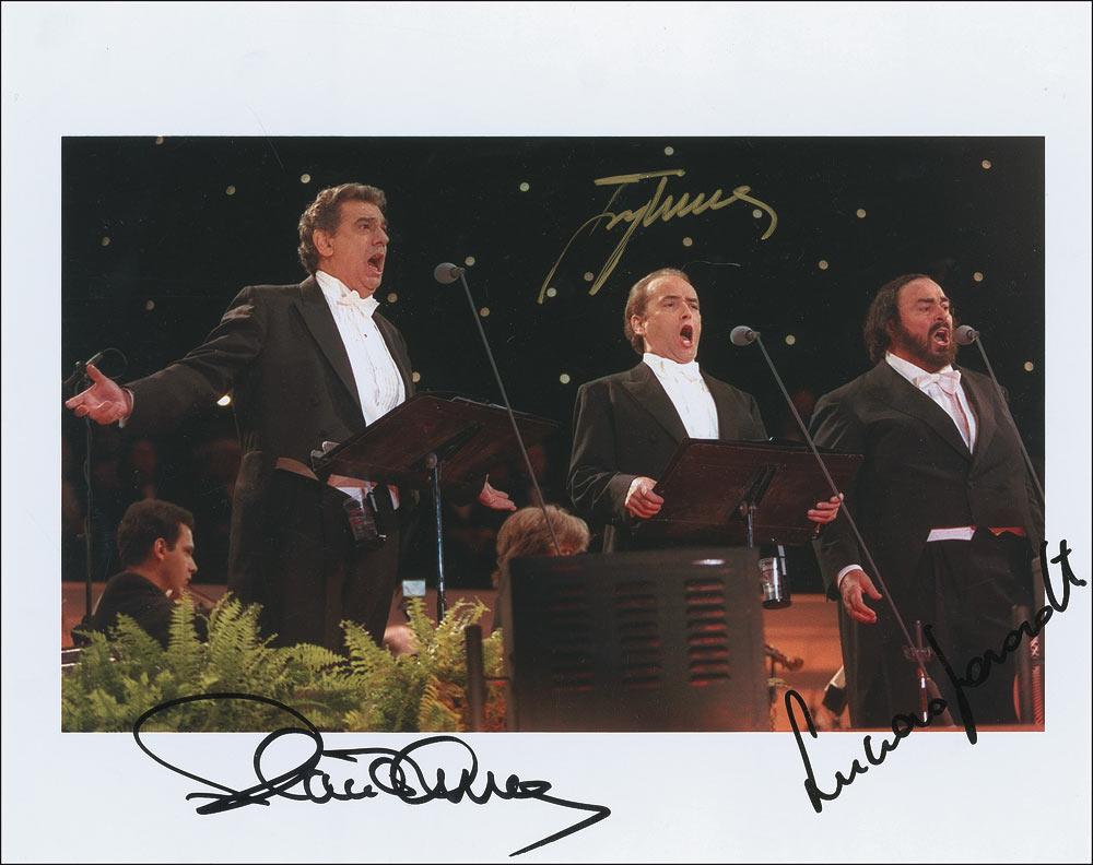 Color glossy 10 x 8 photo of the Three tenors performing, signed in black felt tip by Placido Domingo and Luciano Pavarotti, and in gold ink by Jose Carreras. In fine condition, with a couple small surface dings to top border and edge. Pre-certified PSA/DNA and RRAuction COA.