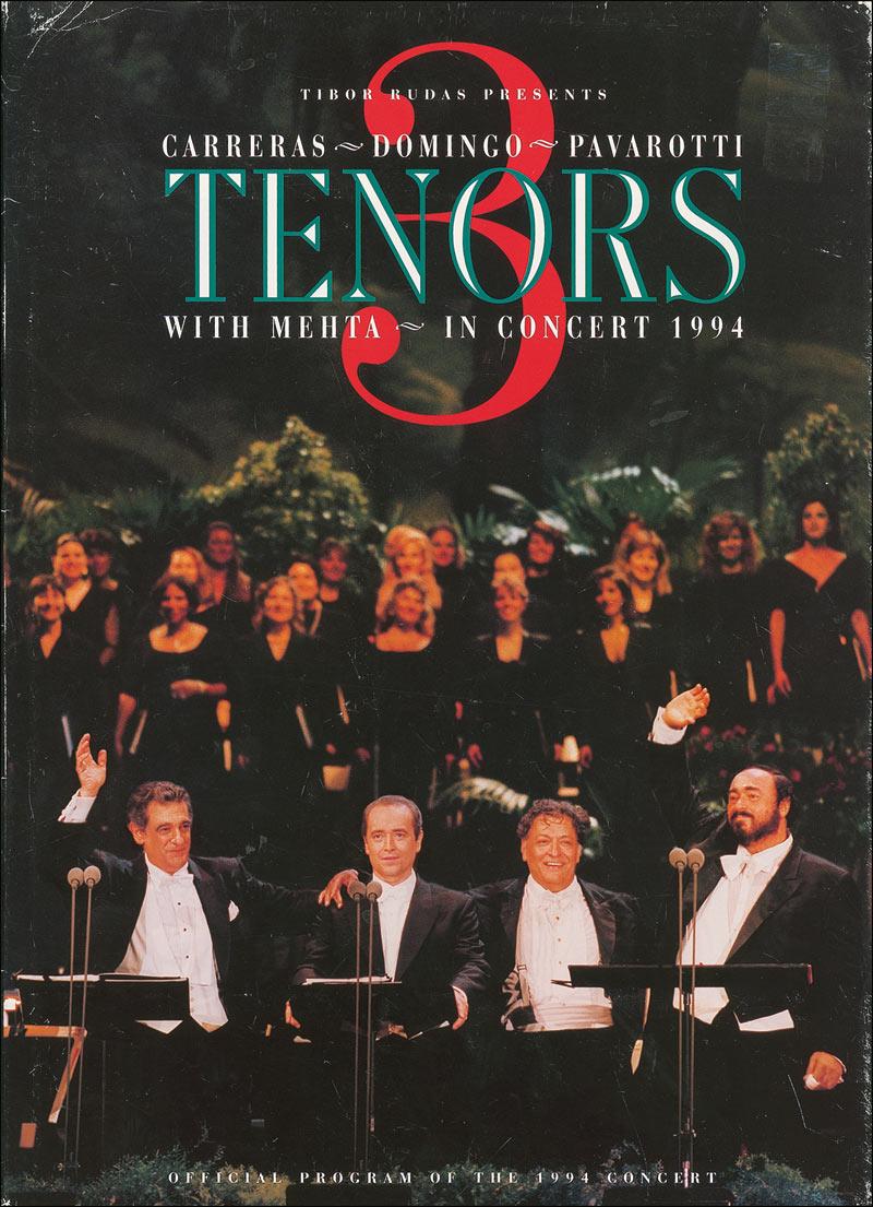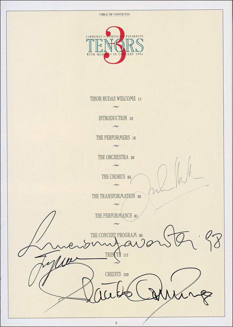 Signed book: The Three Tenors: Official Program of the 1994 Concert. Later printing. San Francisco: HarperCollins, 1994. Hardcover with dustjacket, 10.25 x 14.25, 128 pages. Signed in black felt tip on the Table of Contents page by Jose Carreras, Placido Domingo, Luciano Pavarotti (adding “98”), and conductor Zubin Mehta. In fine condition, with some ink irregularity to Mehta’s name; the dustjacket rates very good with moderate creasing and edge wear.