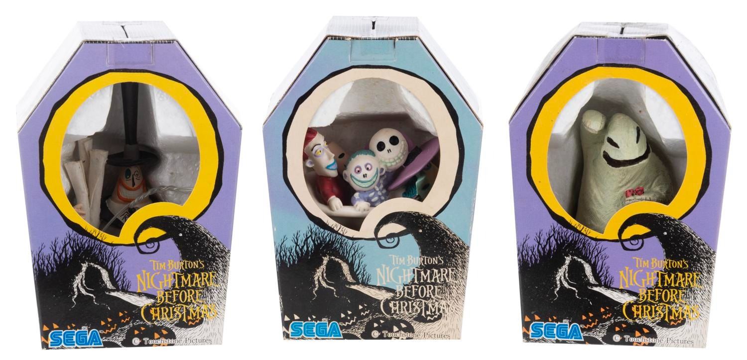 (SEGA, 1998) Three Japanese "The Nightmare Before Christmas" figurines in the original boxes, including the Mayor of Halloweentown, Oogie Boogie, and Lock, Shock, and Barrel in their bathtub. Measuring 3" x 4" x 5.5" tall in their original boxes, the figures and boxes are in good condition with light soiling and creases from storage and age.