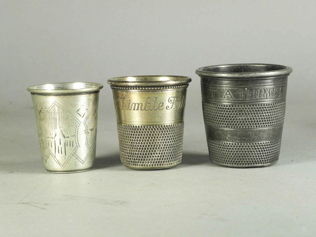 Three Thimble Style Shot Glasses. Two nickel plated brass and pewter. Various sizes and conditions.