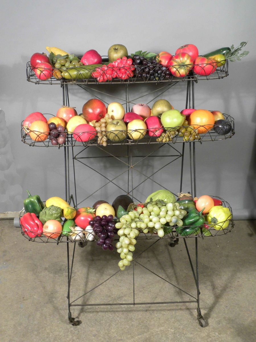 Three Tiered Produce Wire Rack on wheels. Comes with display product. Very good condition. 30 X 38 X 22 inches.