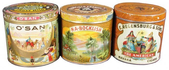 Three Tobacco Tins, 50 Count. NA Bocklish O'San, NA-Bocklish and E. Regnsburg & Sons "The American". Na-Bocklish has original embossed paper lid, "The American" has some scratches and paint drips, O'San excellent condition.