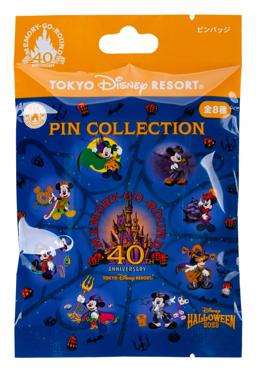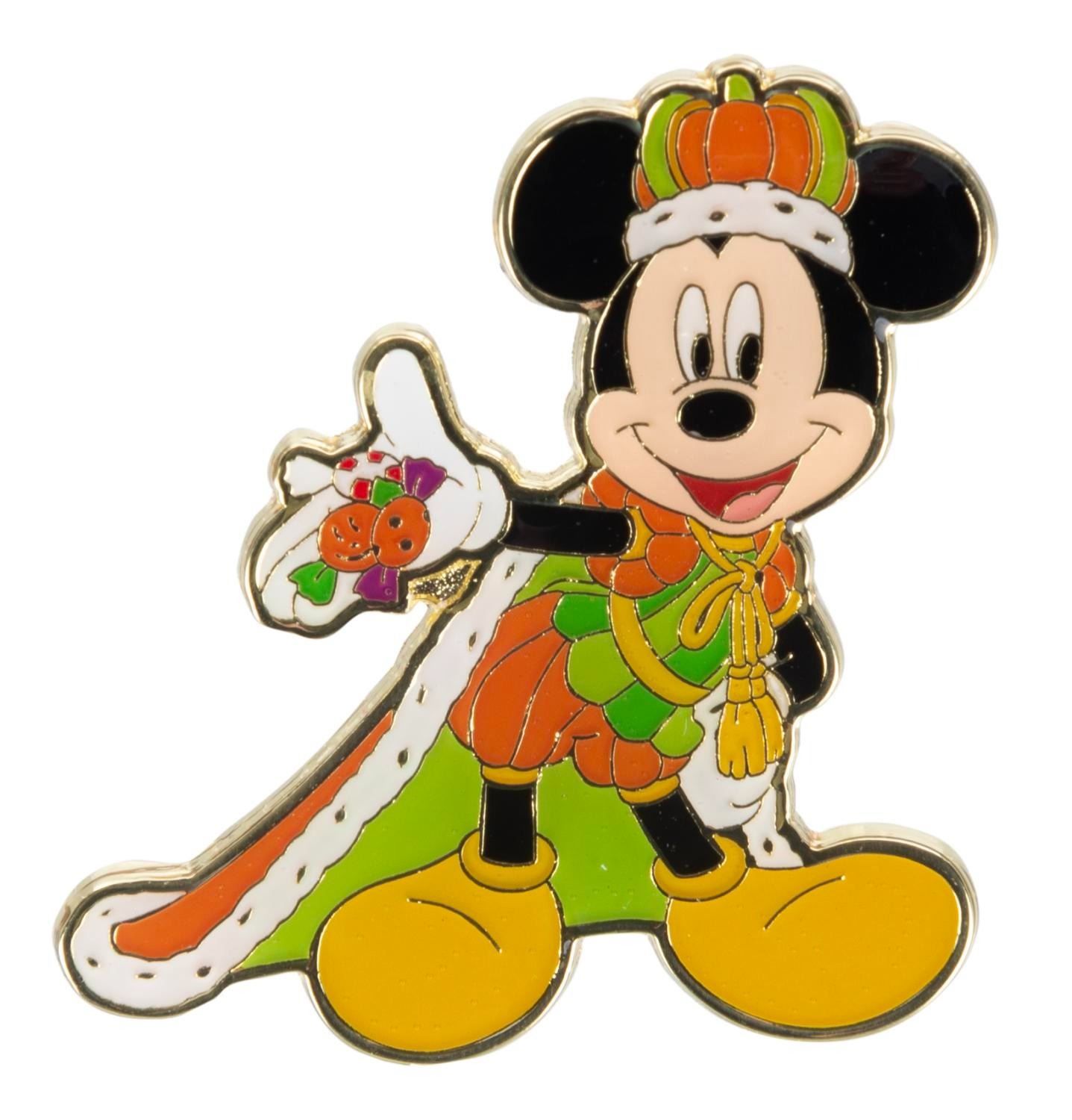 (Tokyo Disney, 2023) Three Memory-Go-Round Halloween blind bag pins released during the Tokyo Disney Resort's 40th anniversary, featuring Mickey Mouse in different costumes. The 1.5" pins are in fine condition, with two sealed and one open that features Mickey in a King Costume.