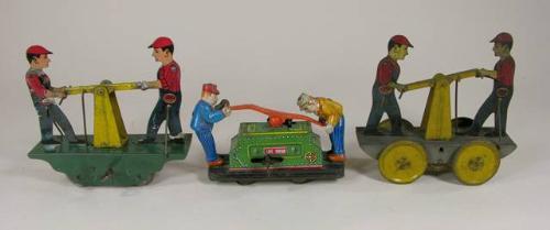 Three Trolley Cars, two by Girard Toys and one tin wind-up. Fair to Excellent Cond.