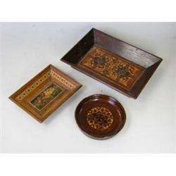 Three Tunbridge ware trays, one worked with two rosettes within flared rosewood rectangular sides, 16.5cm wide, another with rosette circular, 9cm diameter and the third floral and rectangular, 11cm wide (3) £70-100