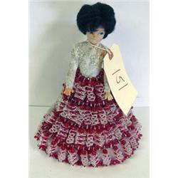 Two dolls are made of a soft material. One is made of nylon covered cloth She is dressed in a early twentieth century dress and red hooded cape. She has brown hair and is on a musical stand. She is in fair condition. The other doll is made of polyurethane filled material from the Stuart, Inc. He is approximately 8 inches in a sitting position. He is a retired gentleman wearing a brown plaid and tweed outfit and wearing a red hat. He is reading the Tax Exempts laws. He is in good condition. The last doll of this lot is rather unique. She is made of plastic and is approximately 10 inches with brown hair and is wearing a skirt that is made of beads, lace and metal. It is red and white with a white lace top. She is in good condition.
