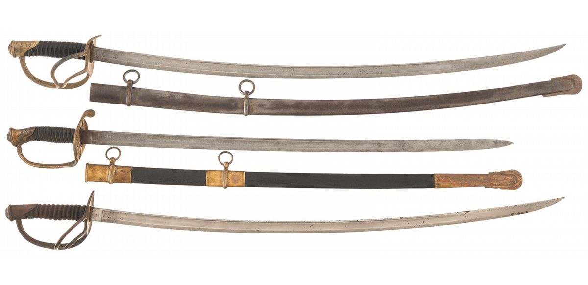 1) U.S. Roby 1860 Sword, 34 3/4" blade with 1865 date, 40 3/4" OAL, with scabbard (some wire loss, throat absent). 2) 1840-Pattern Officer's Sword, 32" etched double fuller blade. 37 1/2" OAL, with a gilt brass hilt, wire wrapped sharkskin grip, and leather and brass scabbard. 3) U.S. Roby 1860 Sword, 35" blade, 1865 date, 41" OAL (some grip material loss). (All fair overall).
