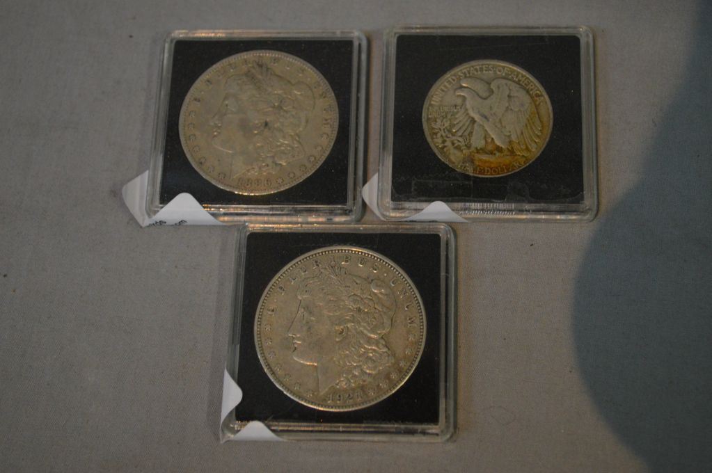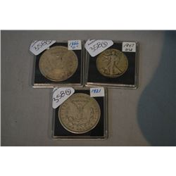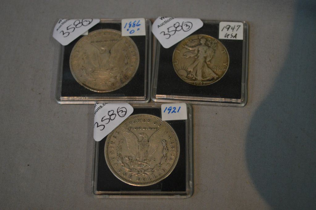 Three US coins including 1921 US silver dollar, 1886 Morgan US silver dollar and a 1947 Walking Liberty silver half dollar