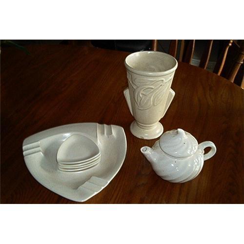 </font></strong>Featuring "3" different pieces of USA pottery. (Hull? Hall? McCoy?) The largest vase decorated with leaves around the top with two handles measures 8 1/4 inches tall; opening diameter measures 5 inches; depth measures 7 7/8 inches; round base diameter of 3 3/4 inches; USA displayed on the Bottom; The 2nd piece of pottery displayed, is a large triangle shaped ashtray with 4 smaller ashtrays in the bottom. Measures 10 inches by 10 inches; the four smaller trays measures 4 inches by 4 inches; The 3rd piece of pottery is a small teapot with decorative large swirls. Measures 6 inches tall with lid, without lid, it stands 3 3/4 inches tall; opening diameter measures 2 3/4 inches; depth measures 3 inches; base diameter measures 2 1/4 inches and is embossed: 243-USA. All three items are in very good to excellent condition.</font>