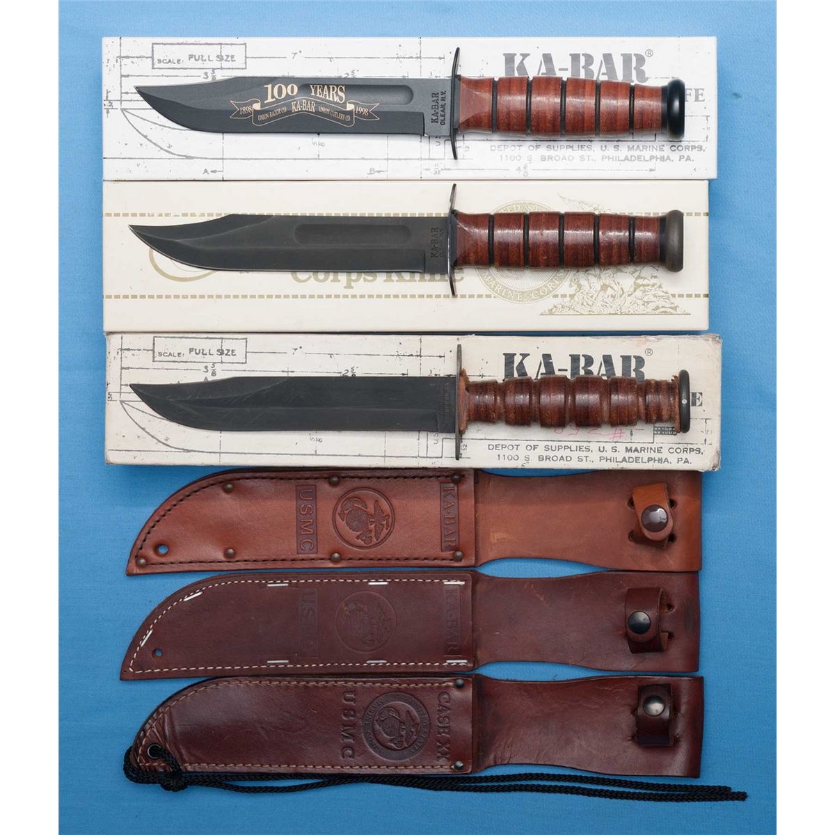 1) Case XX USMC commemorative fight knife with leather sheath and matching box. 2) KA-BAR USMC 100th anniversary commemorative fighting knife with leather sheath and matching box. 3) KA-BAR USMC commemorative fighting knife with leather sheath and matching box. CONDITION: Excellent.