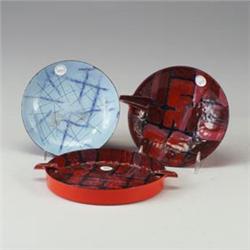 Three VALLENTI (Italy) enameled metal pieces: two ashtrays in red and pink, and a small circular tray with abstract linear designs in black and shades of blue (some minor nicks to enamel). All marked. Dia.: 8 3/4", 7 1/4", and 6 1/4" $200 - 300