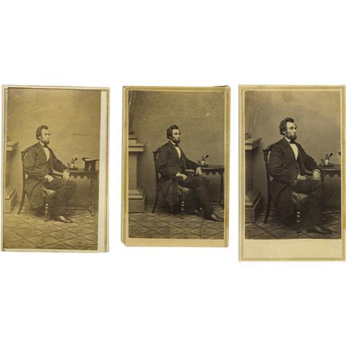 <B>Three Variant Views of the Famous 1861 "Ink Well" Abraham Lincoln Pose.</B></I> Abraham Lincoln posed for the famous "Ink Well" portraits with Alexander Gardener on February 24, 1861. There are five different variants of the photograph. We offer three here. The first is #O-49a; with his right hand in his lap and the left draped down over the arm of the chair. The brim of his top hat is barely visible in the right of the frame. Anthony / Brady imprint on verso. A strong and poignant example of this fantastic picture. In very fine condition; very dark and crisp, an excellent copy; pencil notations on verso; small blemish on the upper edge; adhesive residue visible on the right edge near border; double lined gilt border; square corners. The second image is #O-53b; right hand on his thigh in a fist and left hand resting on the table. The Anthony / Brady imprint on the verso is upside down in relation to the image. The plate this was produced from also had a crack in it; the crack is visible in the lower right corner, crossing Lincoln's foot. In very fine condition; very dark and saturated; light stippling effect in the upper quadrant; light toning on both sides; pencil notations on verso; corners moderately worn; double lined gilt border; square corners. The third image is #O-50b; with his right hand on his thigh and left forearm resting on the table. Lincoln is facing to the side, not forward. His top hat is in full view on the right of the table. Bears no imprint. In very fine condition; light warping from dampness; not as dark and crisp as the other two offered here; double lined gilt border; square corners; emulsion slightly overlaps the border. A wonderful opportunity to own three of the five iconic portraits!<BR><BR><b>Shipping:</b> Small Flat (<a target="_blank" href="http://www.heritageauctions.com/common/shipping.php">view shipping information</a>)