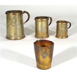 Three Victorian measuring tankards and a horn beaker with applied silver metal heart, largest 20cm high