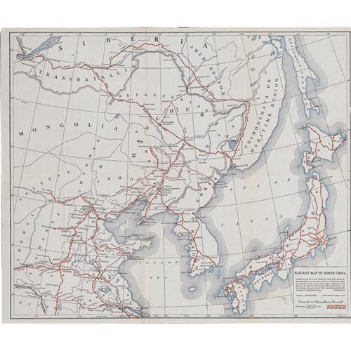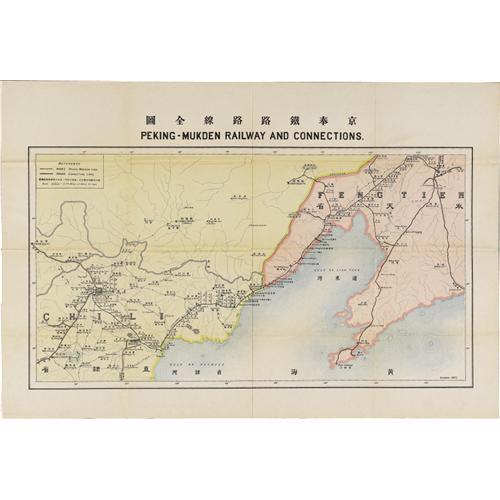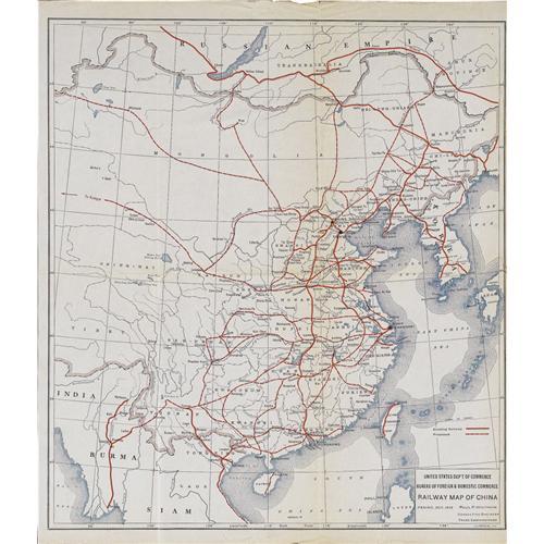 <B>Three Vintage Chinese Railway Maps.</B></I> An important group of maps showing the great railroads that influenced the course of Far Eastern economic, military, and social history for most of the 20th century. Included are the following:<BR><B>Railway Map of China,</B></I> 16.5" x 19", by Paul P. Whitham, for U.S. Department of Commerce, Bureau of Foreign & Domestic Commerce, New York, 1918. Existing and proposed roads are drawn for a vast territory stretching from Russian Siberia to Burma and Vietnam.<BR><B>Railway Map of North China,</B></I> 20.25" x 17", "compiled by J.V.A MacMurray from the Russian Government map of the ways of communication of Asiatic Russia (1911) and other sources, and drawn by Mr. Y.Y. Wu under the supervision of Mr. Murray Sullivan of the Chuchow-Chinchow Railway Administration", New York, 1918. The title of this map is deceptive in that it also shows the rail lines of Korea and Japan.<BR><B>Peking-Mukden Railway and Connections,</B></I> 33.25" x 22.75",n.p., October, 1922. A huge bi-lingual English-Chinese production showing each stop along this important railway.<BR>All maps have original folds and are lightly toned. One map has a small push that could be repaired easily.<BR><BR><b>Shipping:</b> Books & Catalogs (<a target="_blank" href="http://www.heritageauctions.com/common/shipping.php">view shipping information</a>)