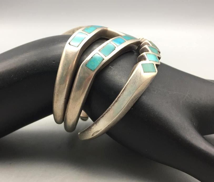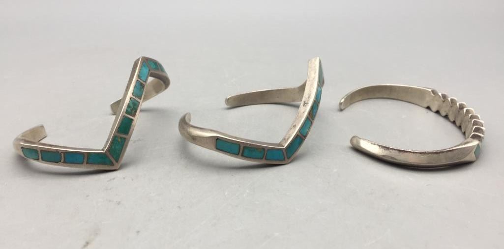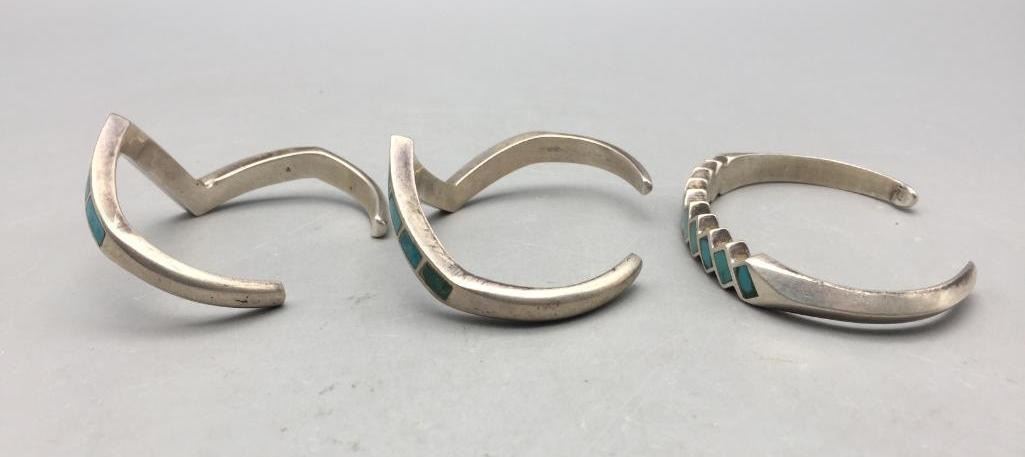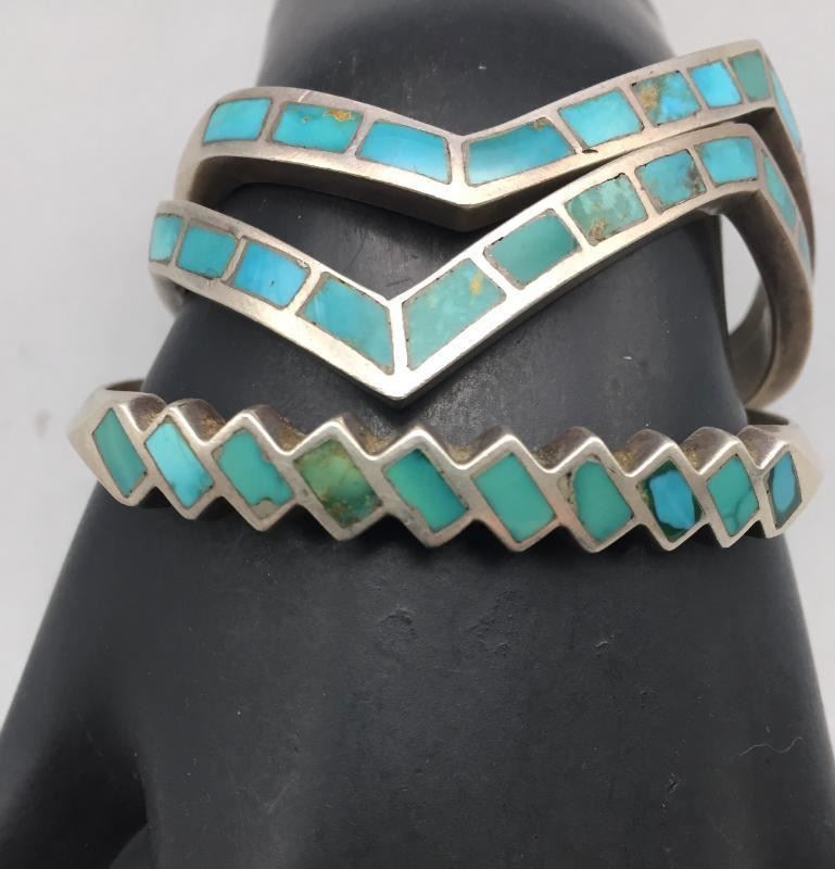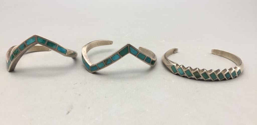 Included for sale in this lot are three vintage inlay bracelets featuring greenish turquoise in varying shades. Maker: Unmarked. Approx. Age: Vintage. Size: All three bracelets are approx. 5-1/4" with a 1-1/4" opening, will fit an approx. 6-1/2" wrist. Combined weight of 76.8 grams. Condition: Good for its age, normal wear expected. Please look closely at the pictures - they are an important part of our description. Shipping: There will be a $5 handling, packaging fee for shipping this lot. The actual cost of postage will be added on top of that.
